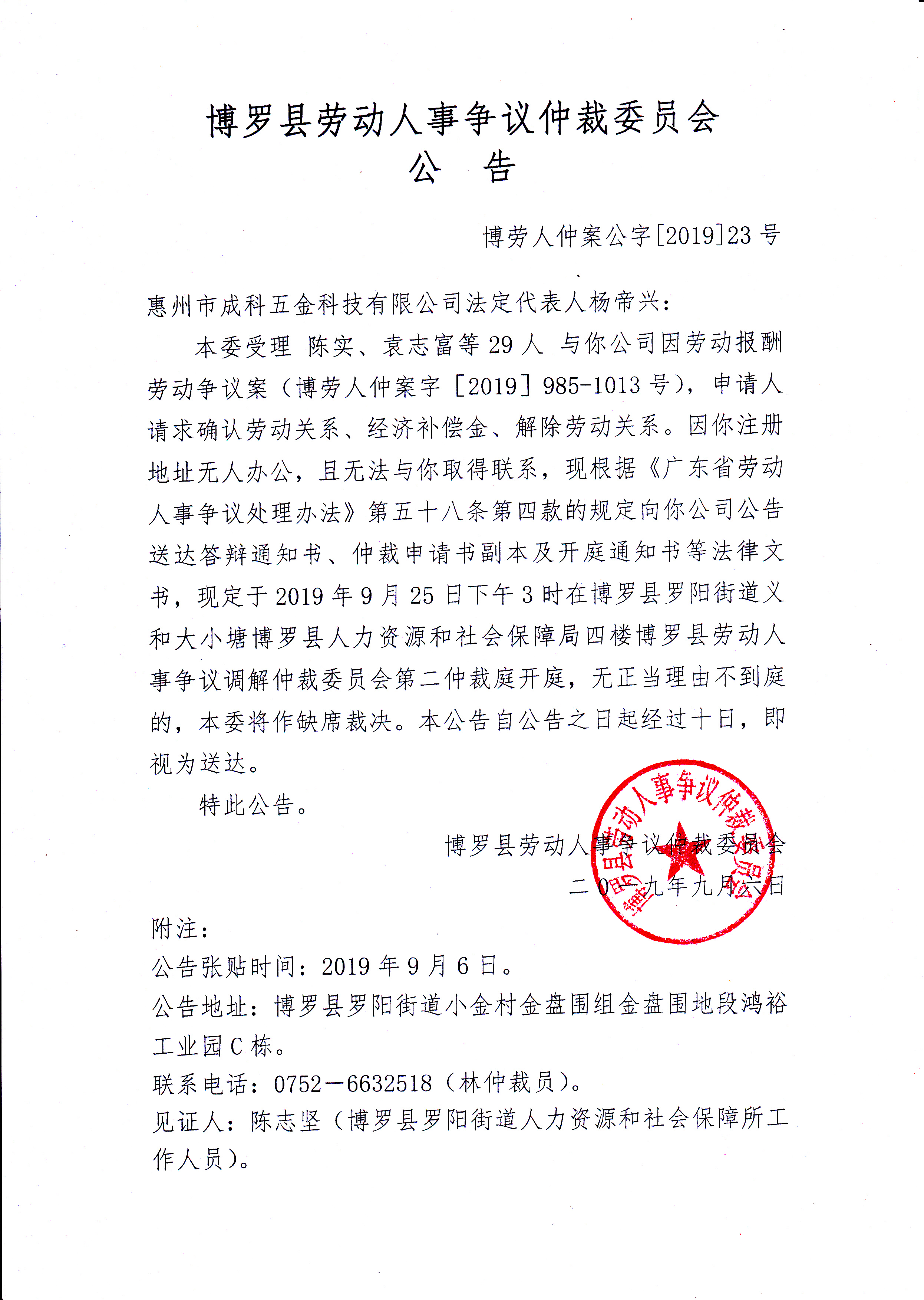 博羅縣勞動人事爭議仲裁委員會公告(博勞人仲案公字[2019]23號)