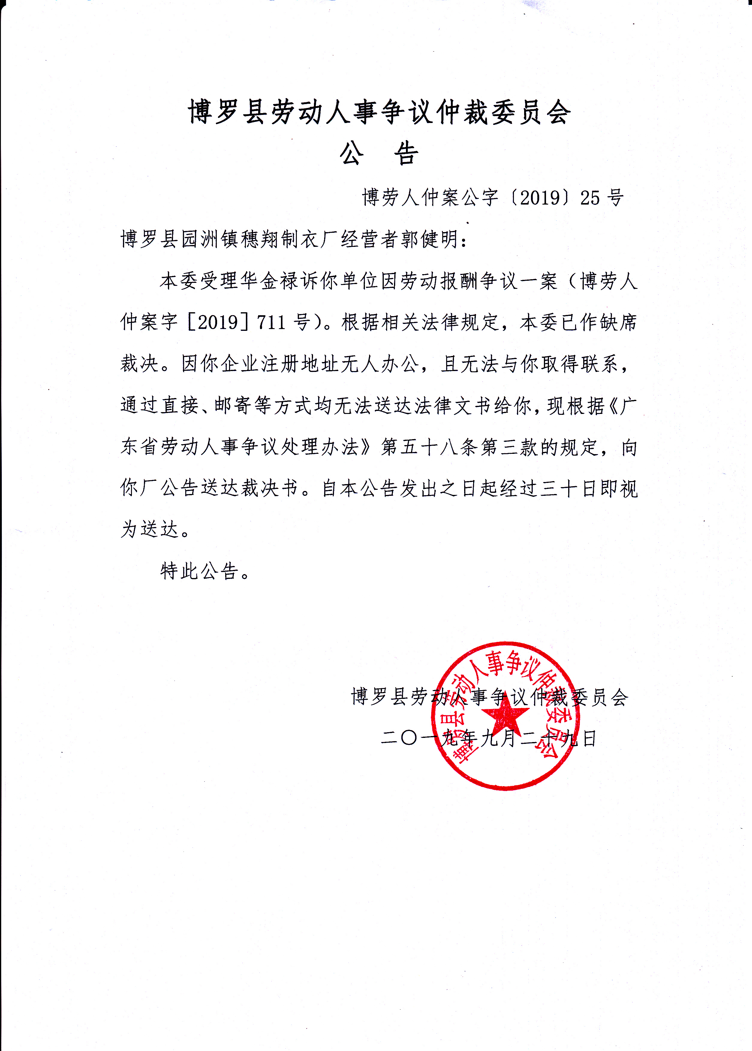 博羅縣勞動人事爭議仲裁委員會公告(博勞人仲案公字[2019]25號)