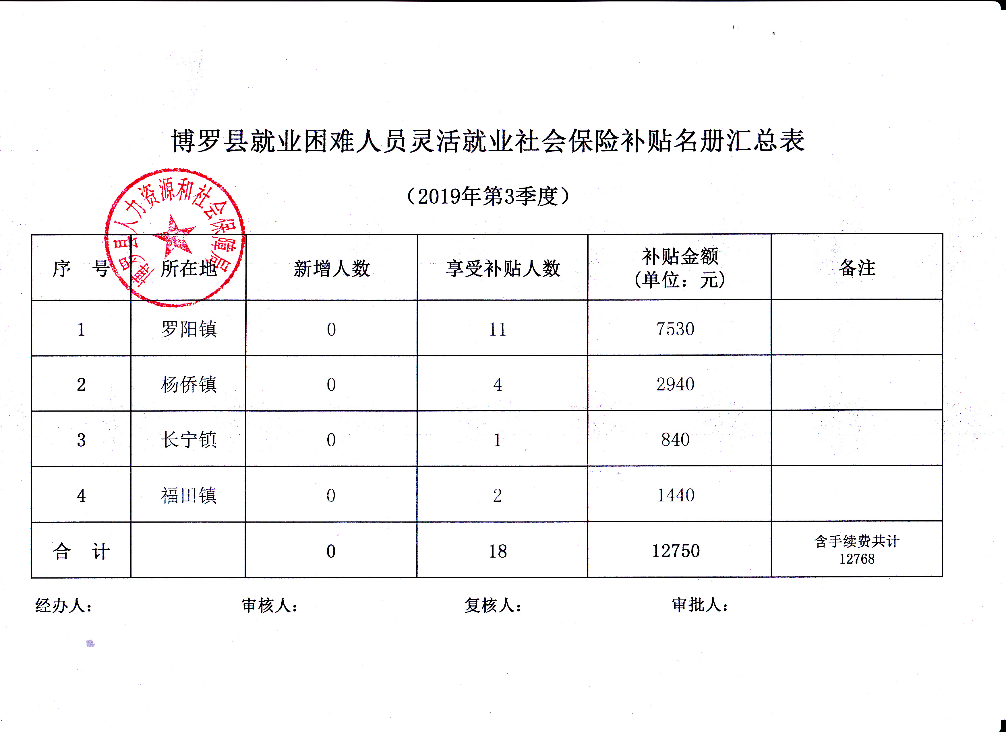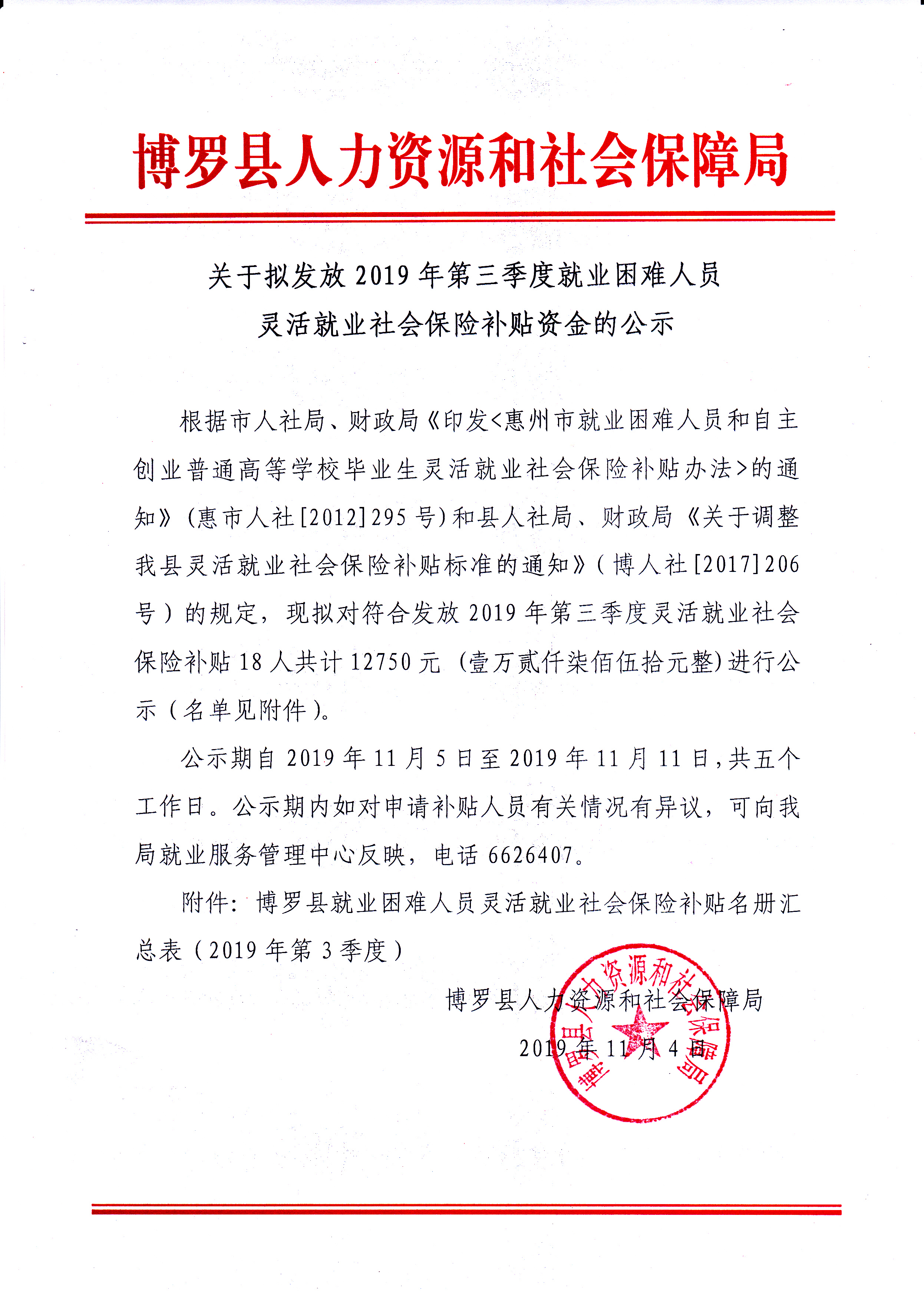 關于擬發放2019年第三季度就業困難人員靈活就業社會保險補貼資金的公示