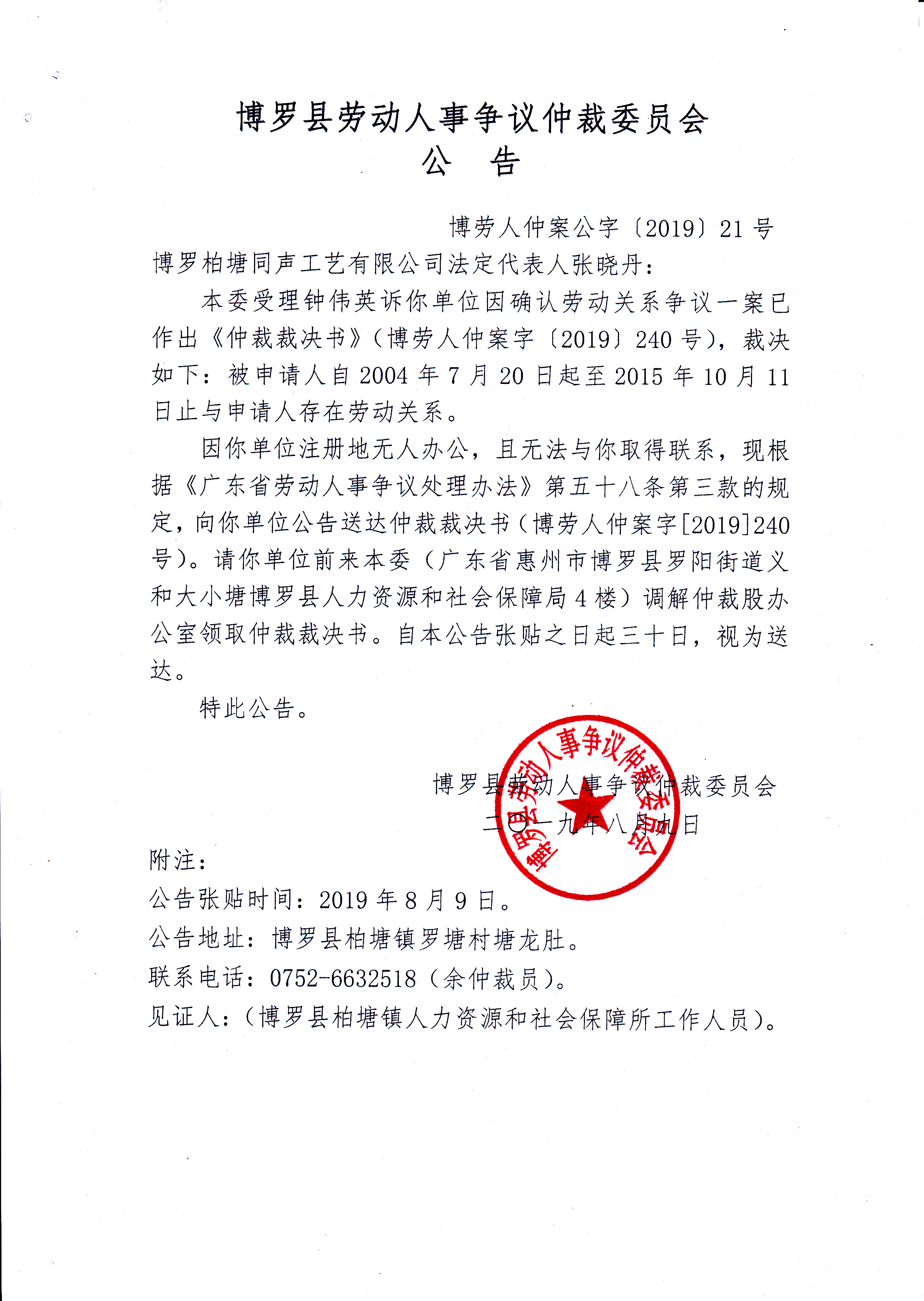博羅縣勞動人事爭議仲裁委員會公告(博勞人仲案公字[2019]21號)