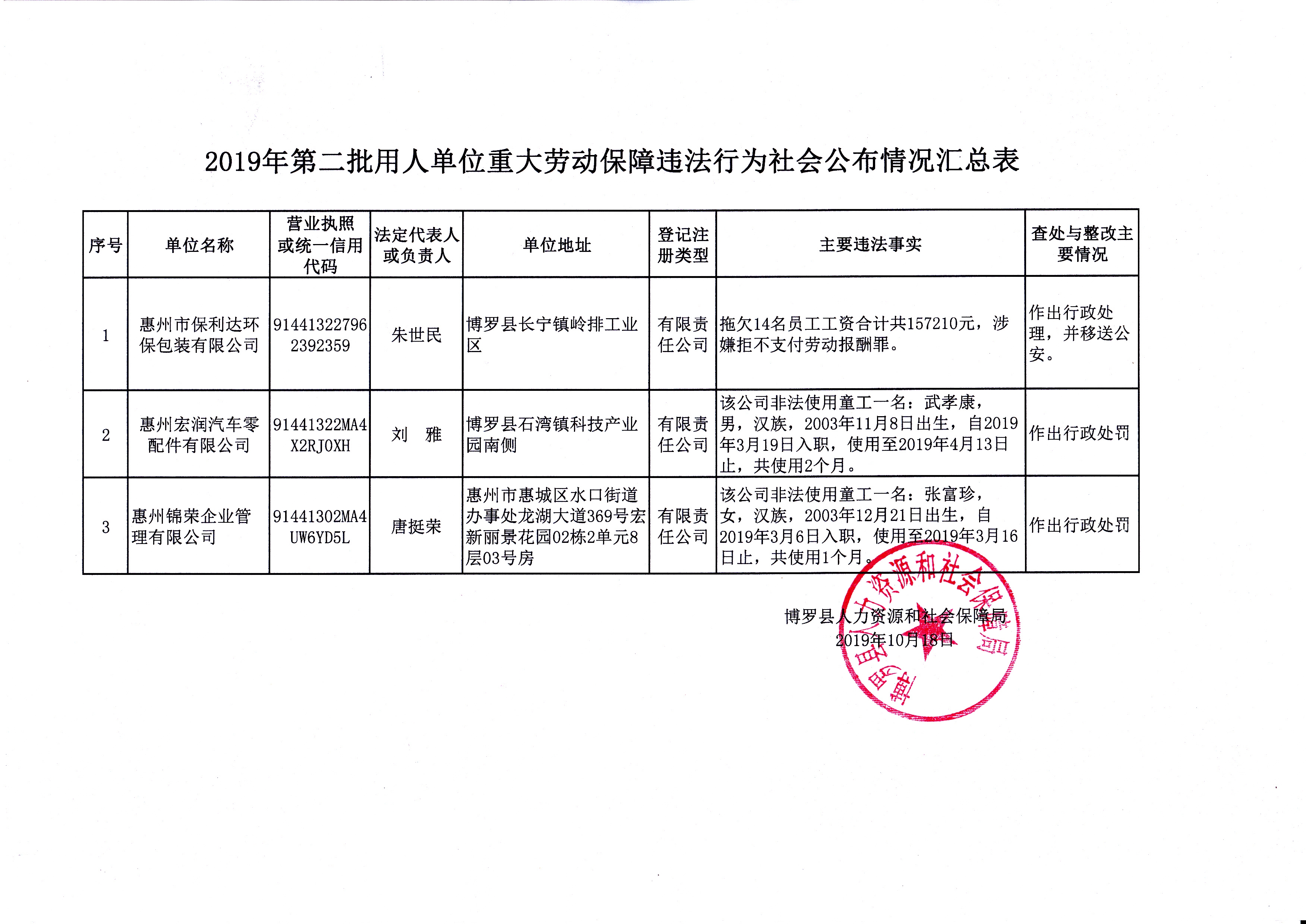 2019年第二批用人單位重大勞動保障違法行為社會公布情況匯總表