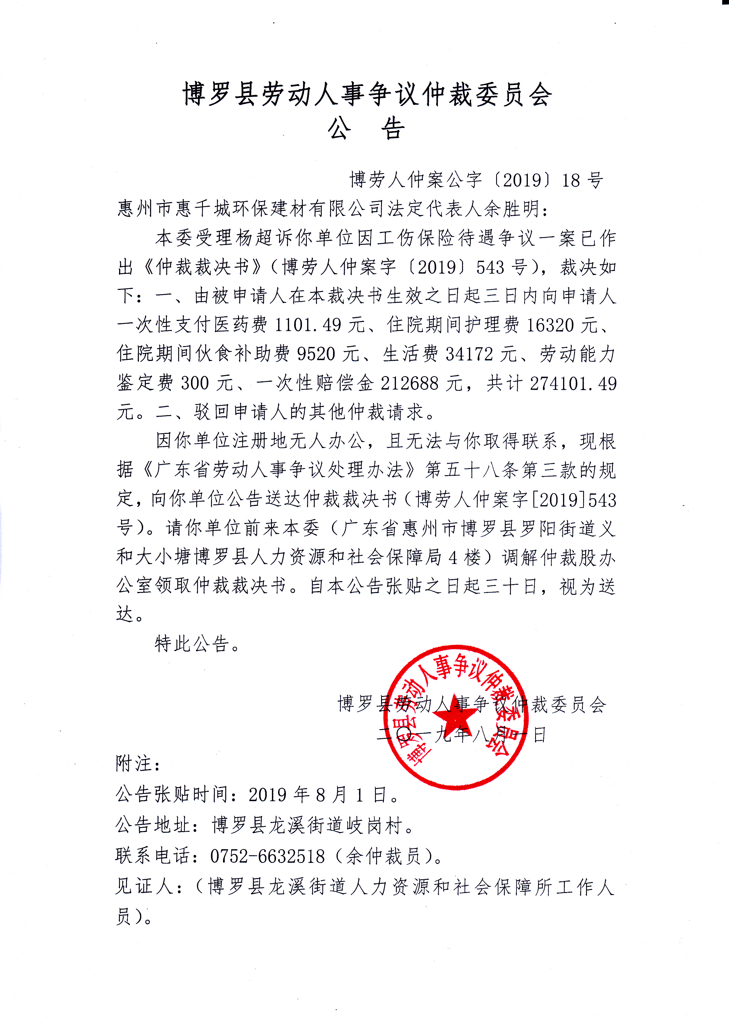 博羅縣勞動人事爭議仲裁委員會公告(博勞人仲案公字[2019]18號)