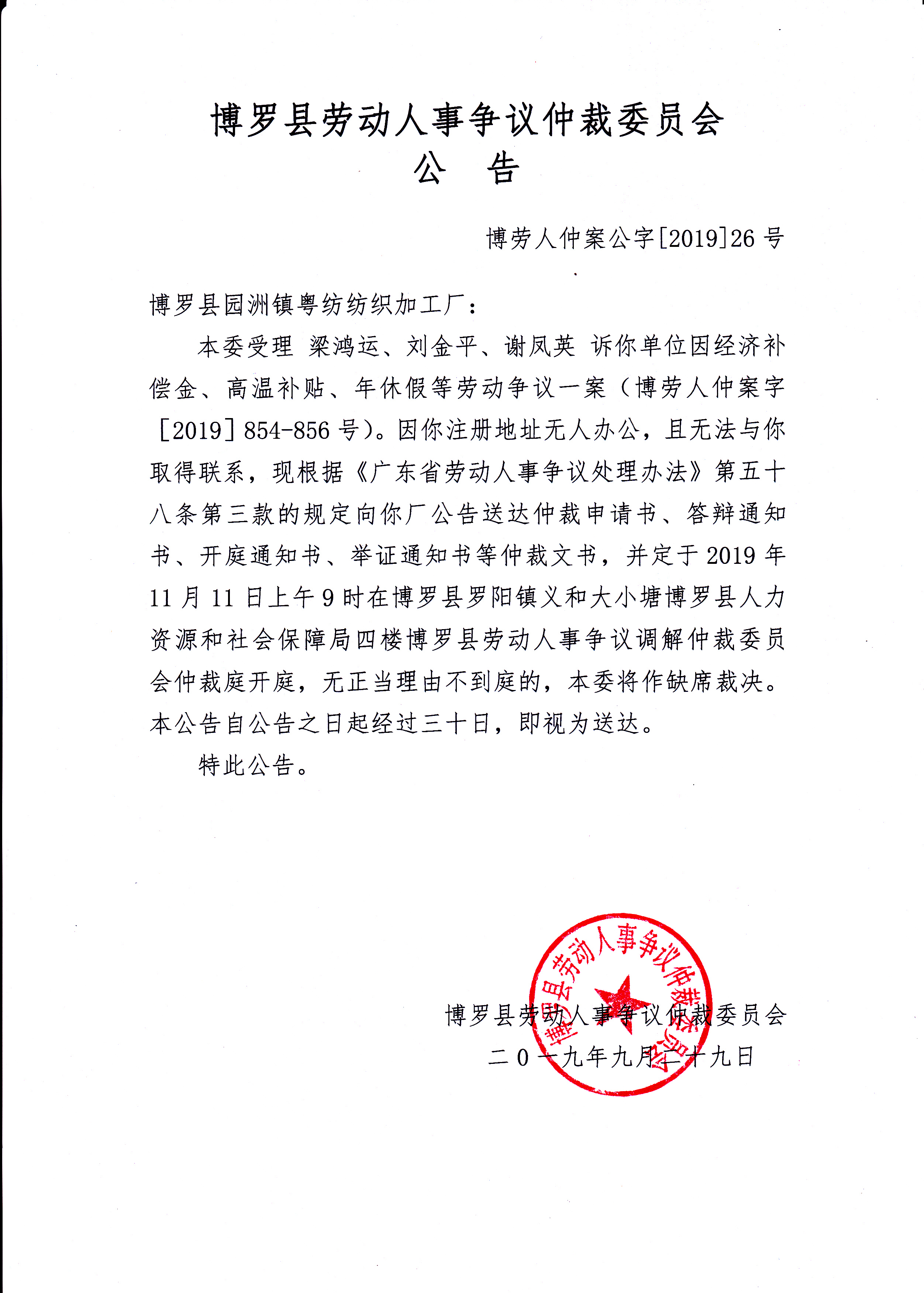 博羅縣勞動人事爭議仲裁委員會公告(博勞人仲案公字[2019]26號)