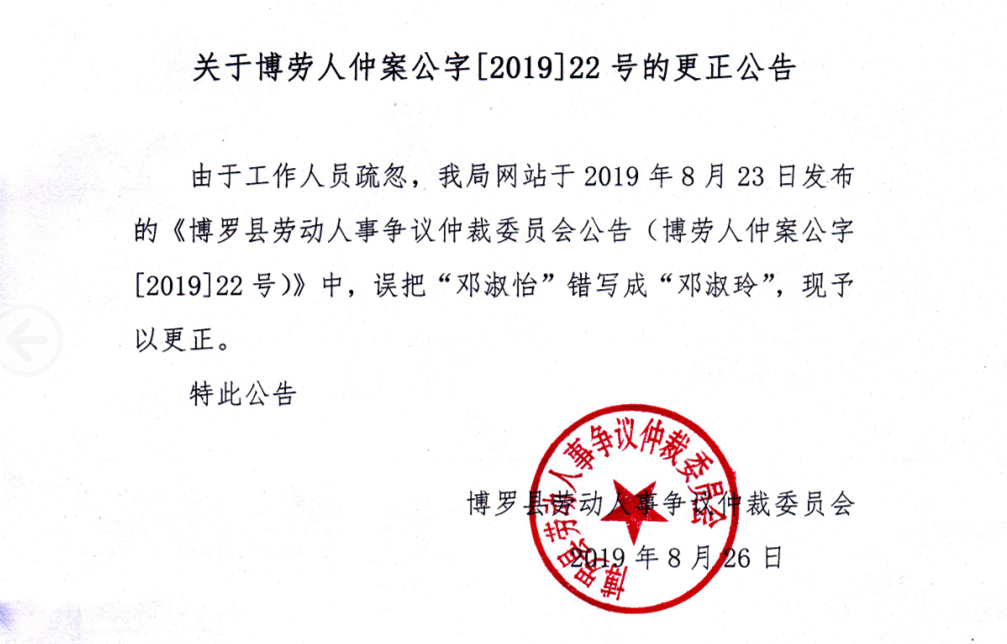 關(guān)于博勞人仲案公字[2019]22號的更正公告