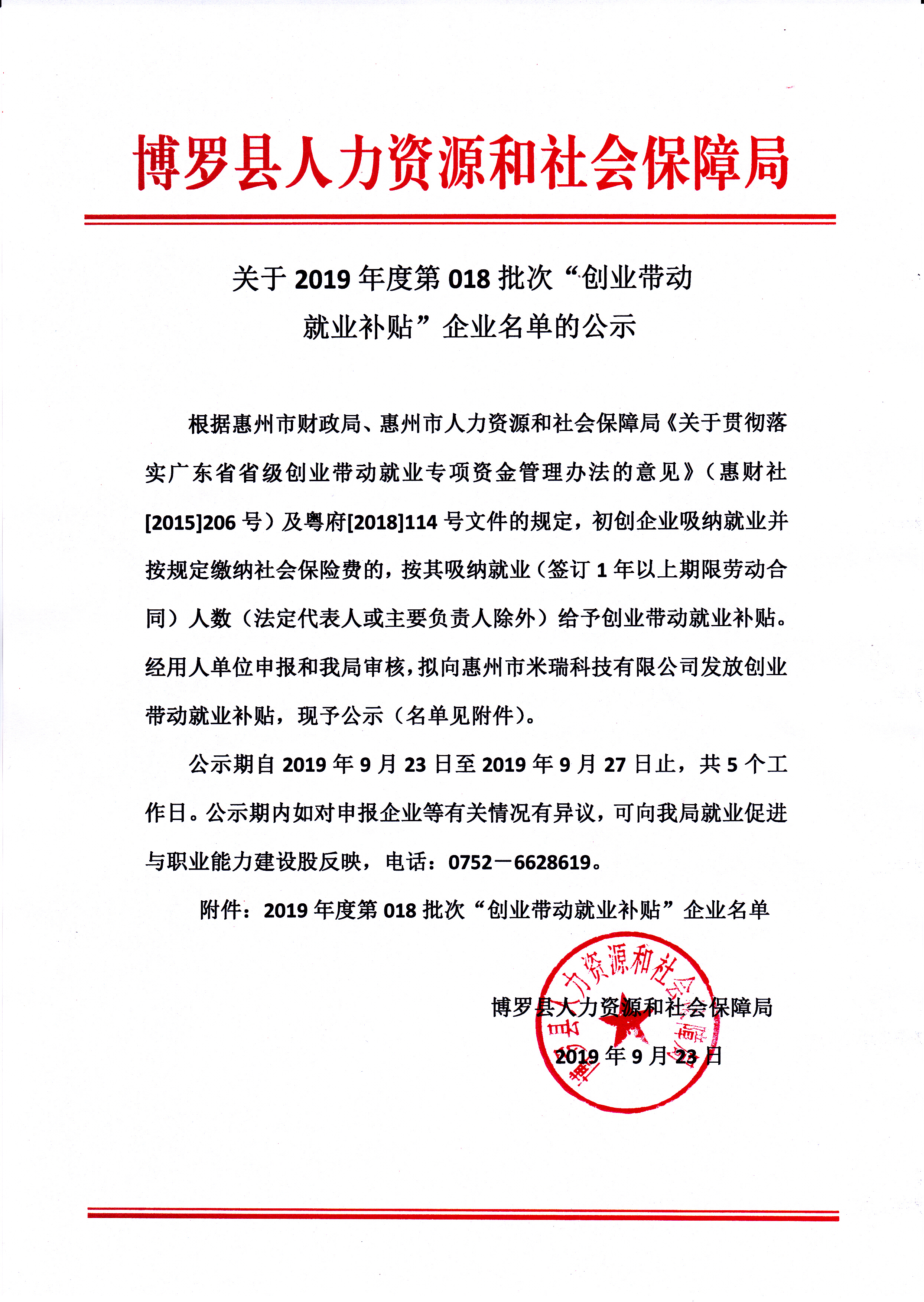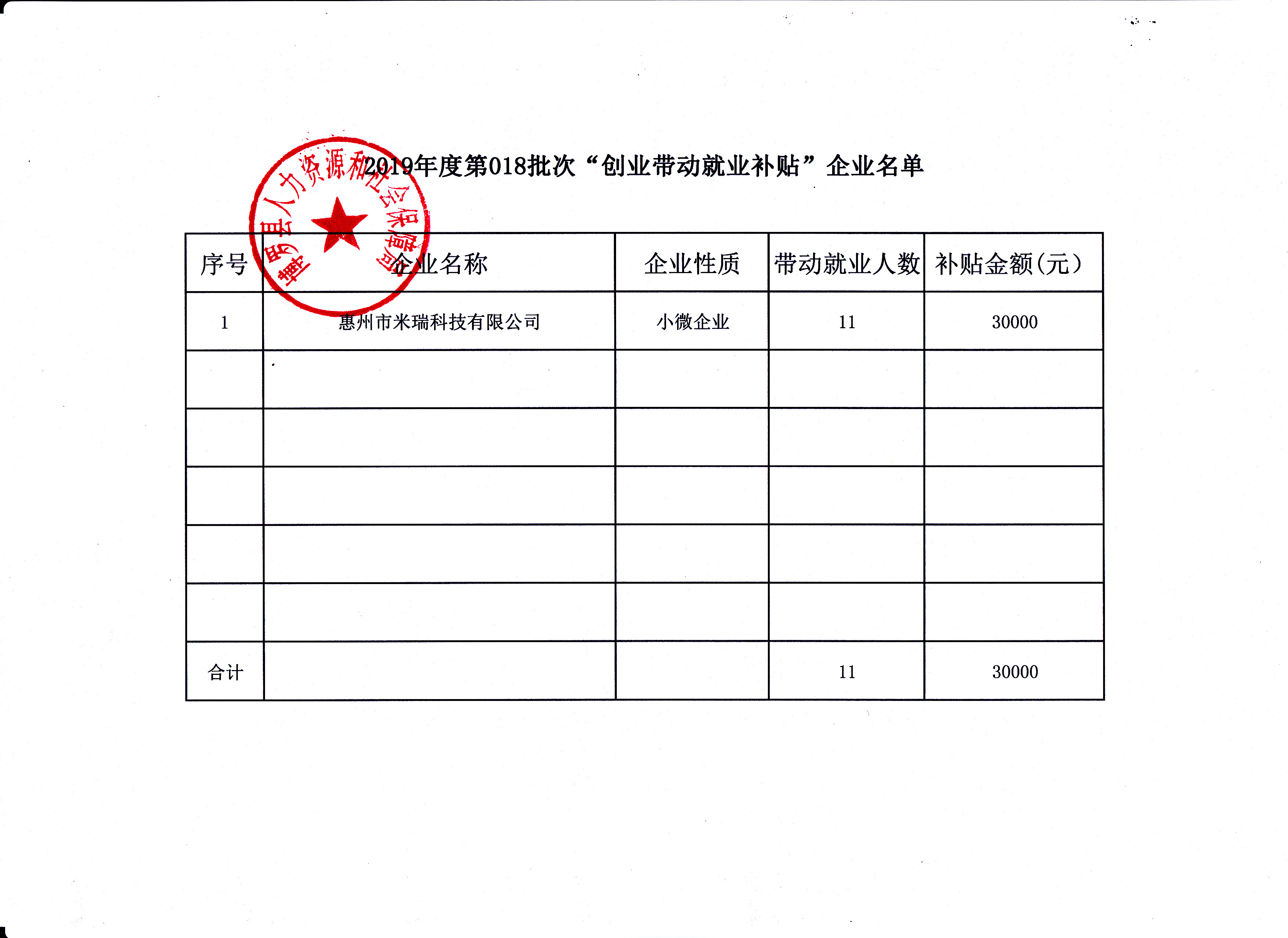 關于2019年度第018批次“創業帶動就業補貼”企業名單的公示