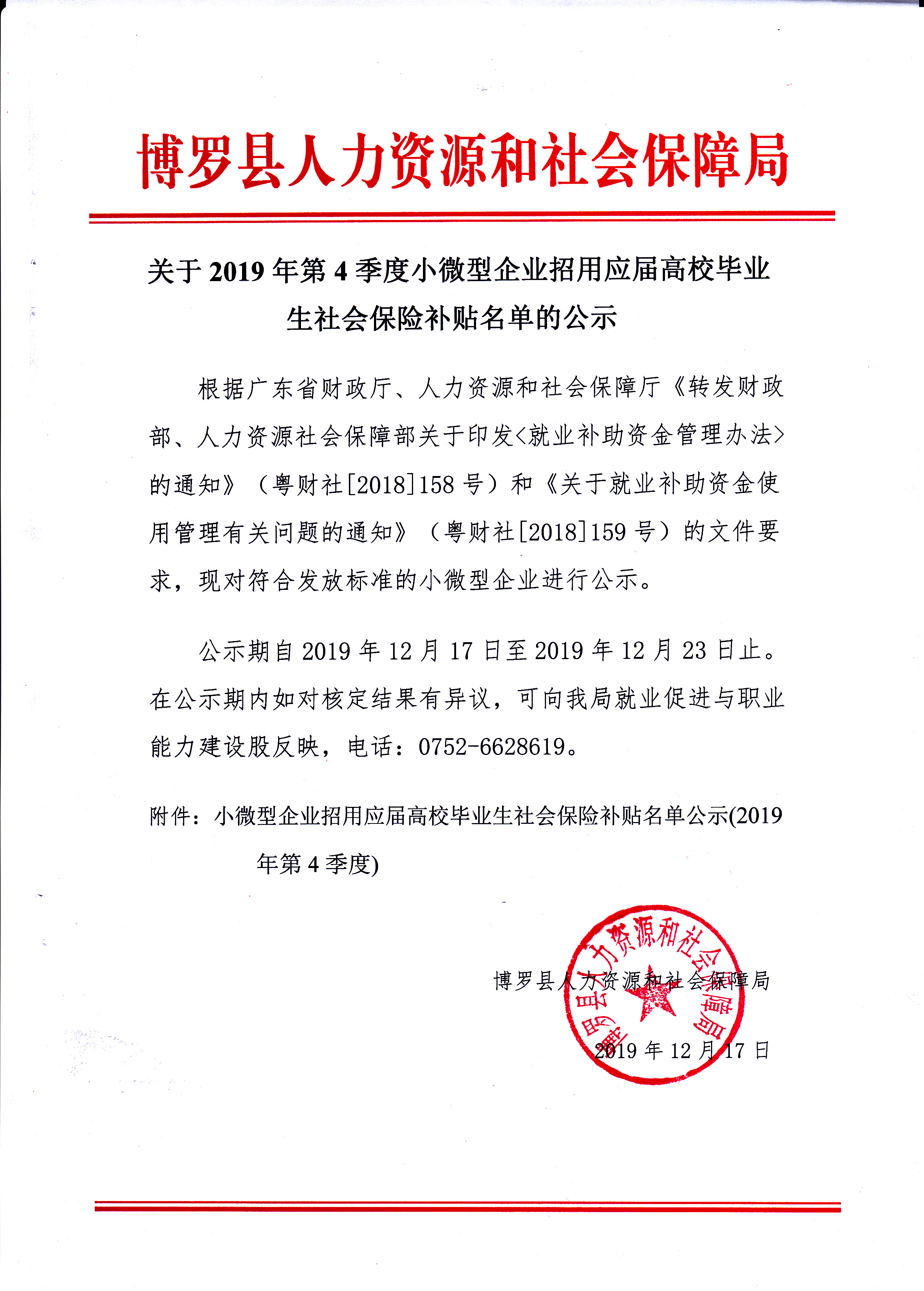 關于2019年第4季度小微型企業招用應屆高校畢業生社會保險補貼名單的公示
