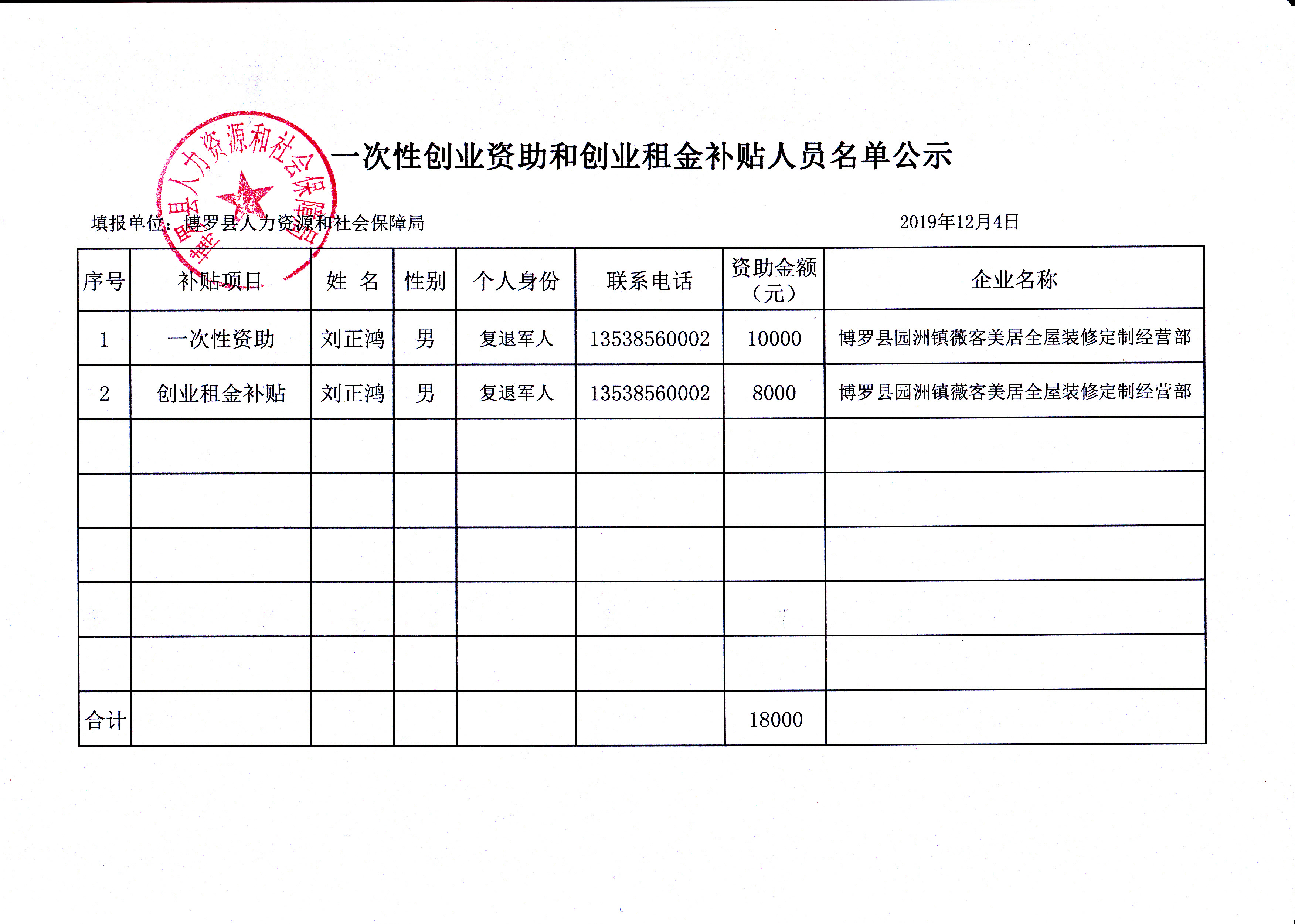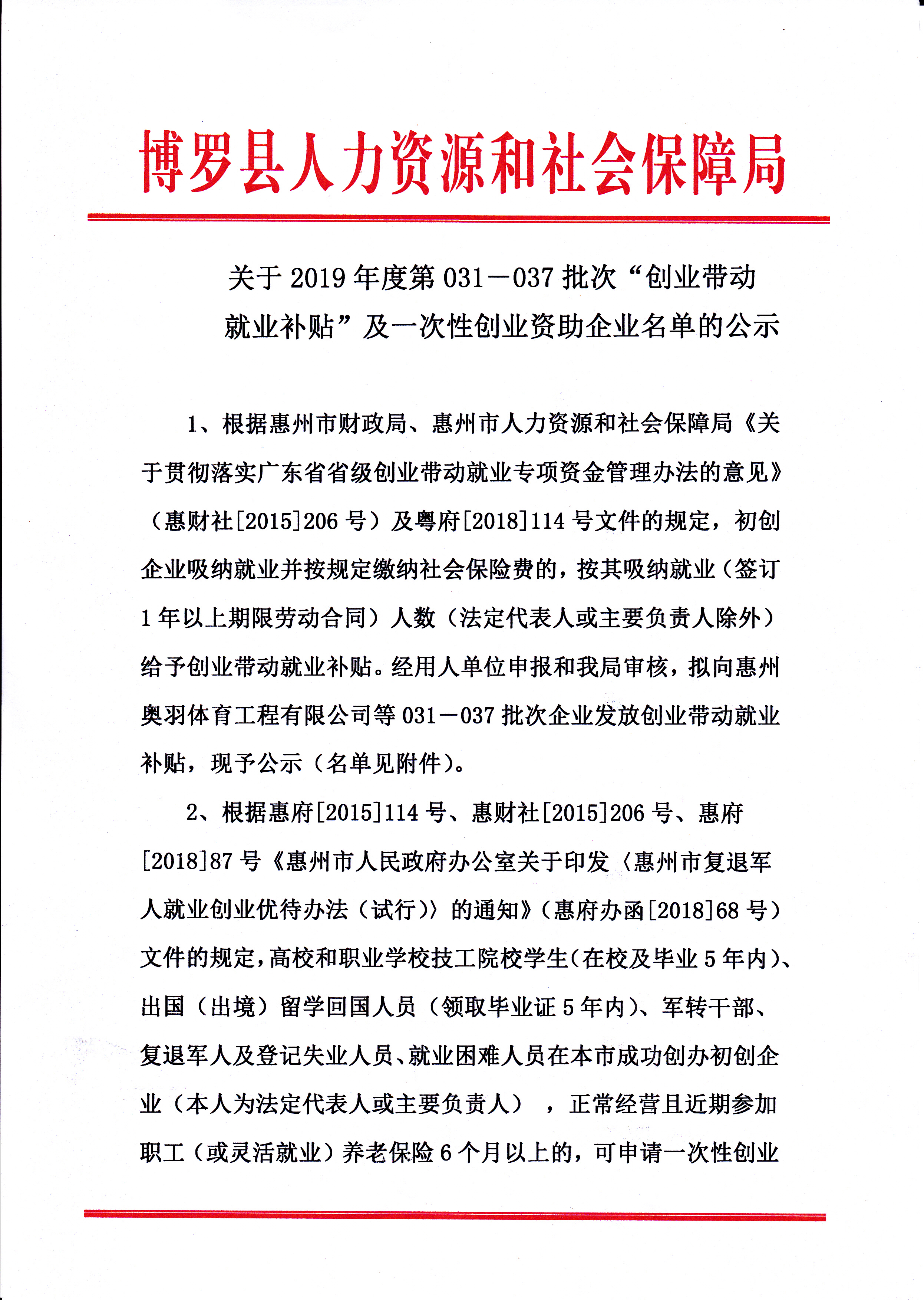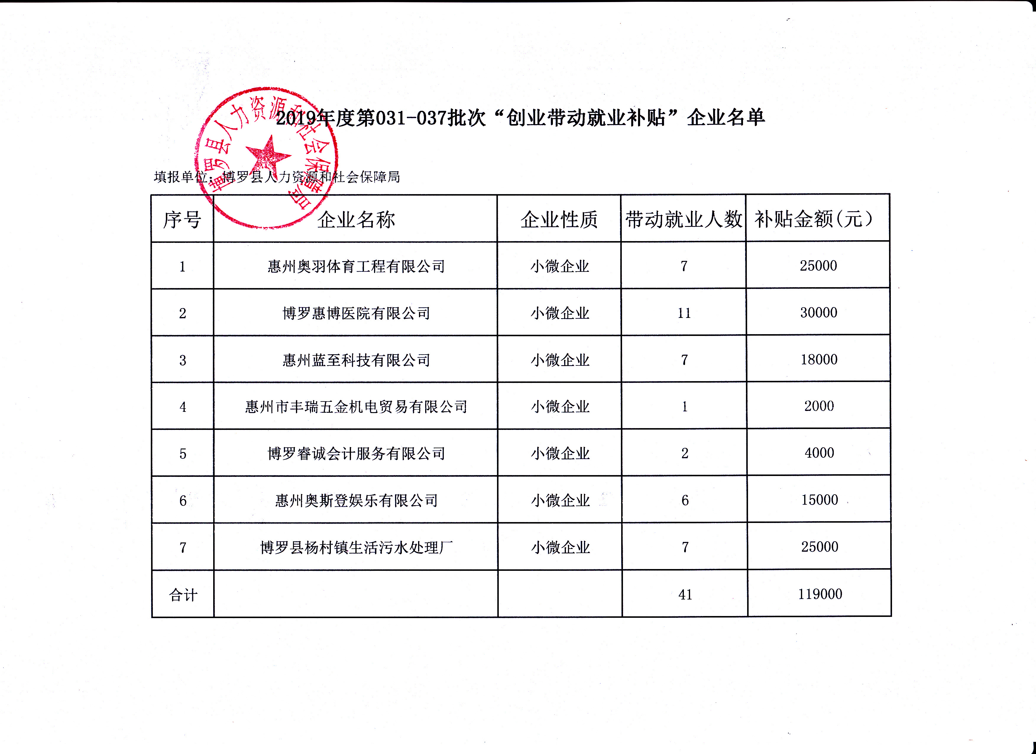關于2019年度第031-037批次“創業帶動就業補貼”及一次性創業資助企業名單的公示