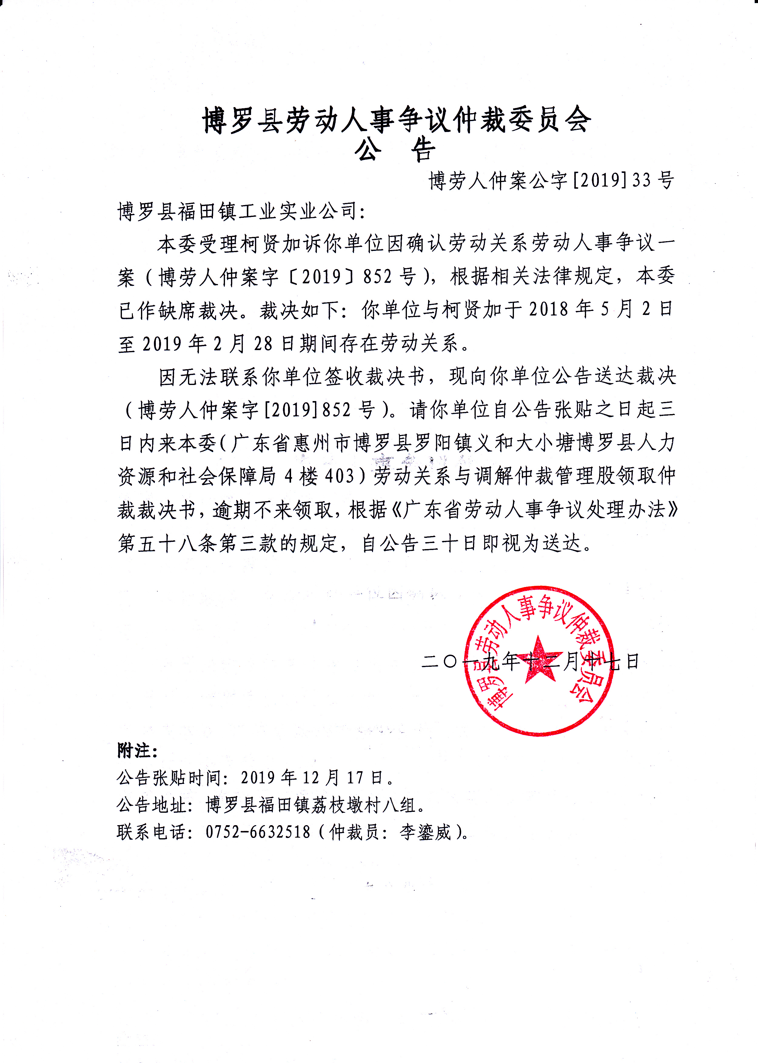 博羅縣勞動人事爭議仲裁委員會公告(博勞人仲案公字[2019]33號)