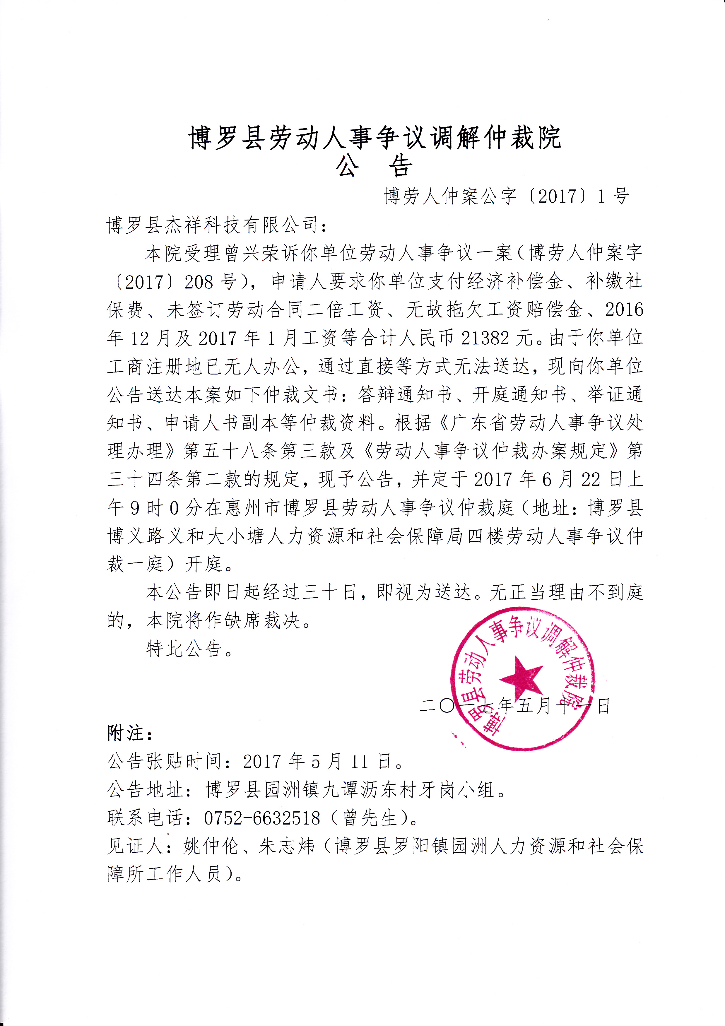 博羅縣勞動(dòng)人事?tīng)?zhēng)議調(diào)解仲裁院公告(博勞人仲案公字〔2017〕1號(hào))