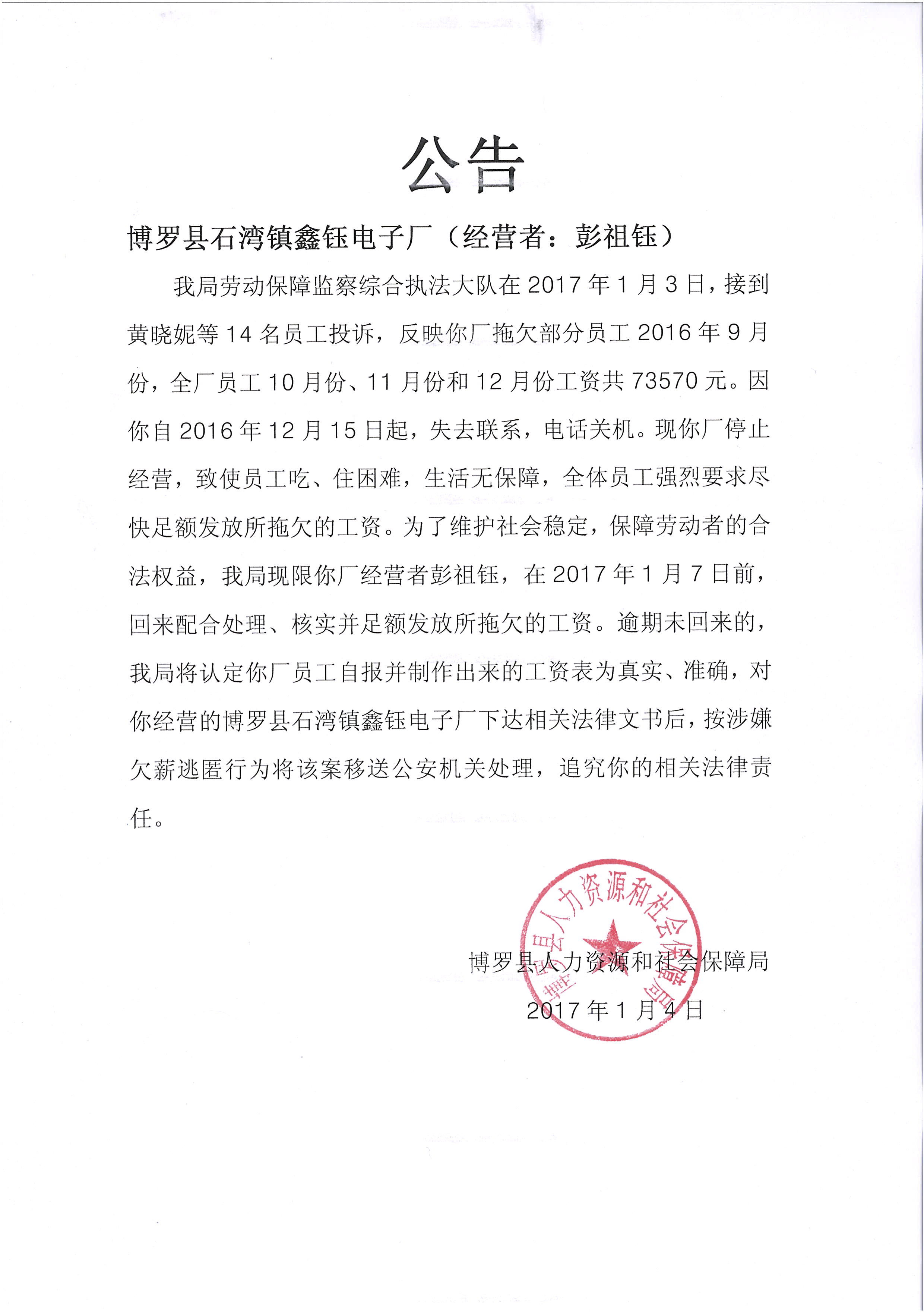 通知用人單位配合處理欠薪案件的公告(博羅縣石灣鎮鑫鈺電子廠)