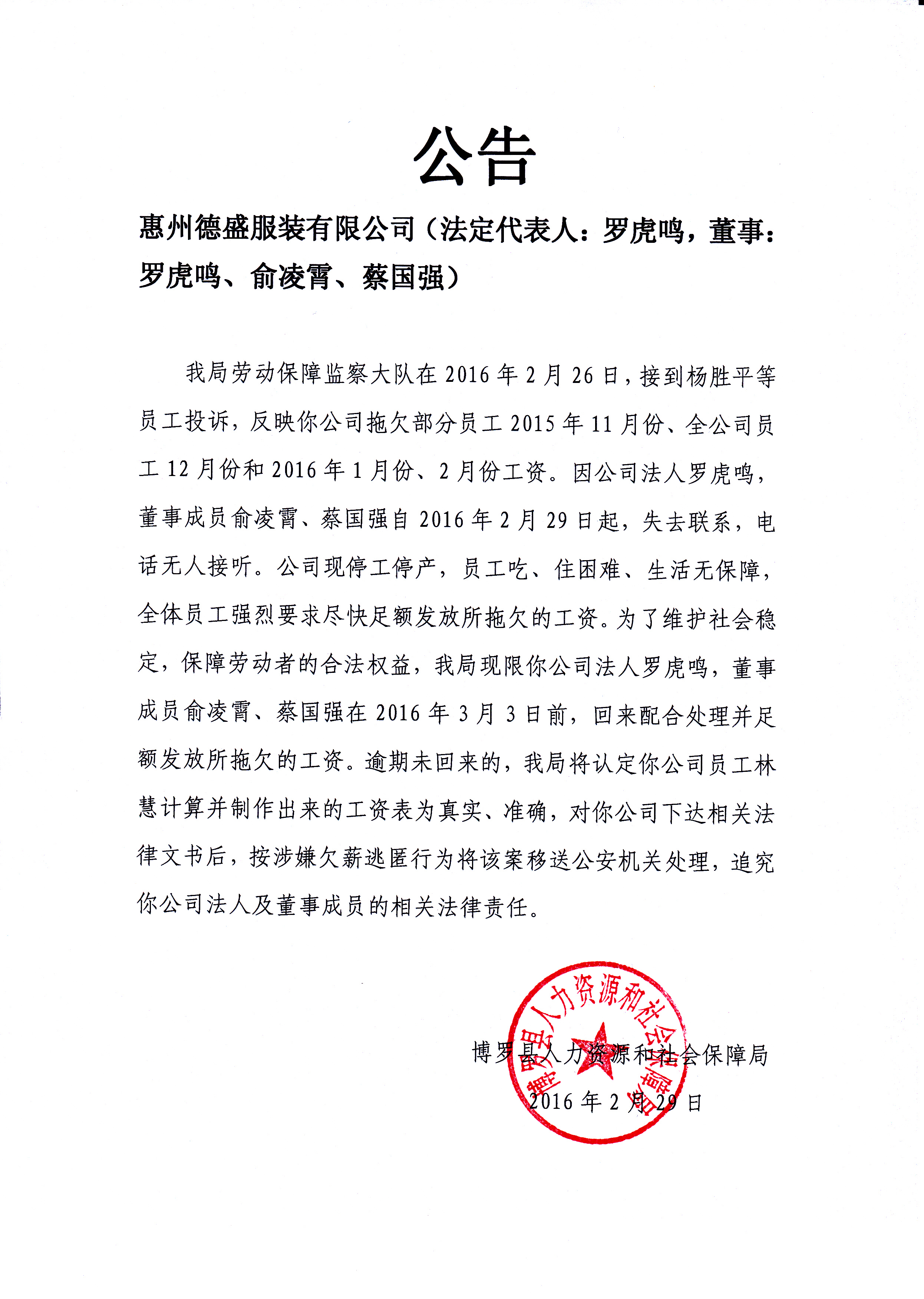 通知用人單位配合處理欠薪案件的公告(惠州德盛服裝有限公司)