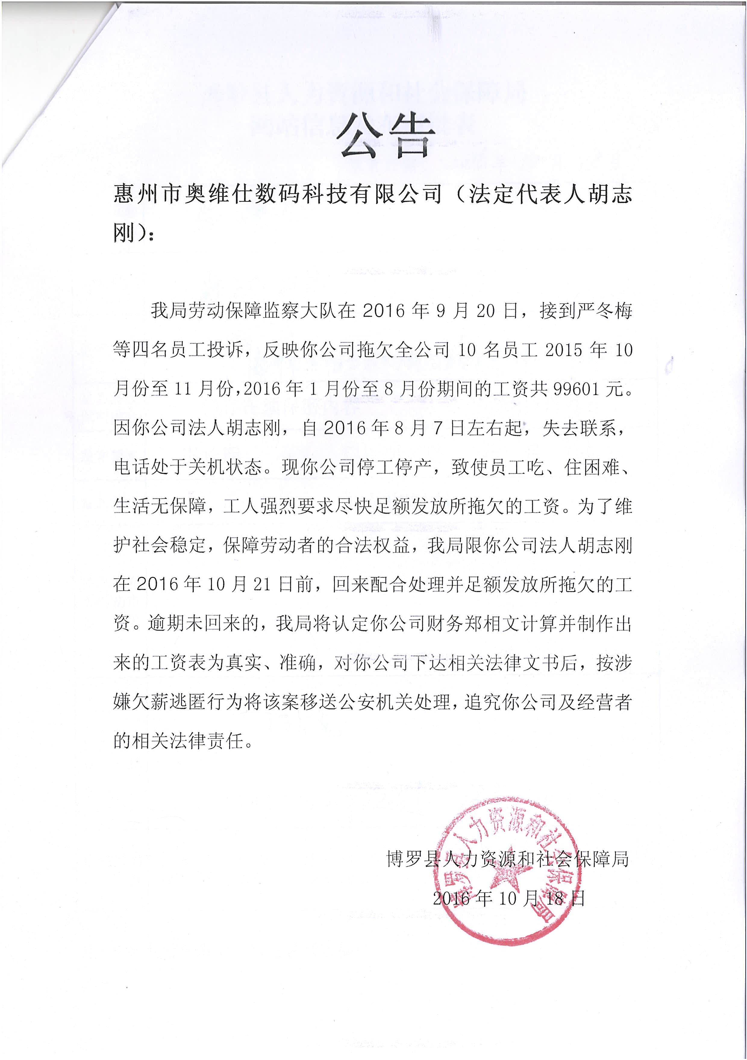 通知用人單位配合處理欠薪案件的公告(惠州市奧維仕數碼科技有限公司)