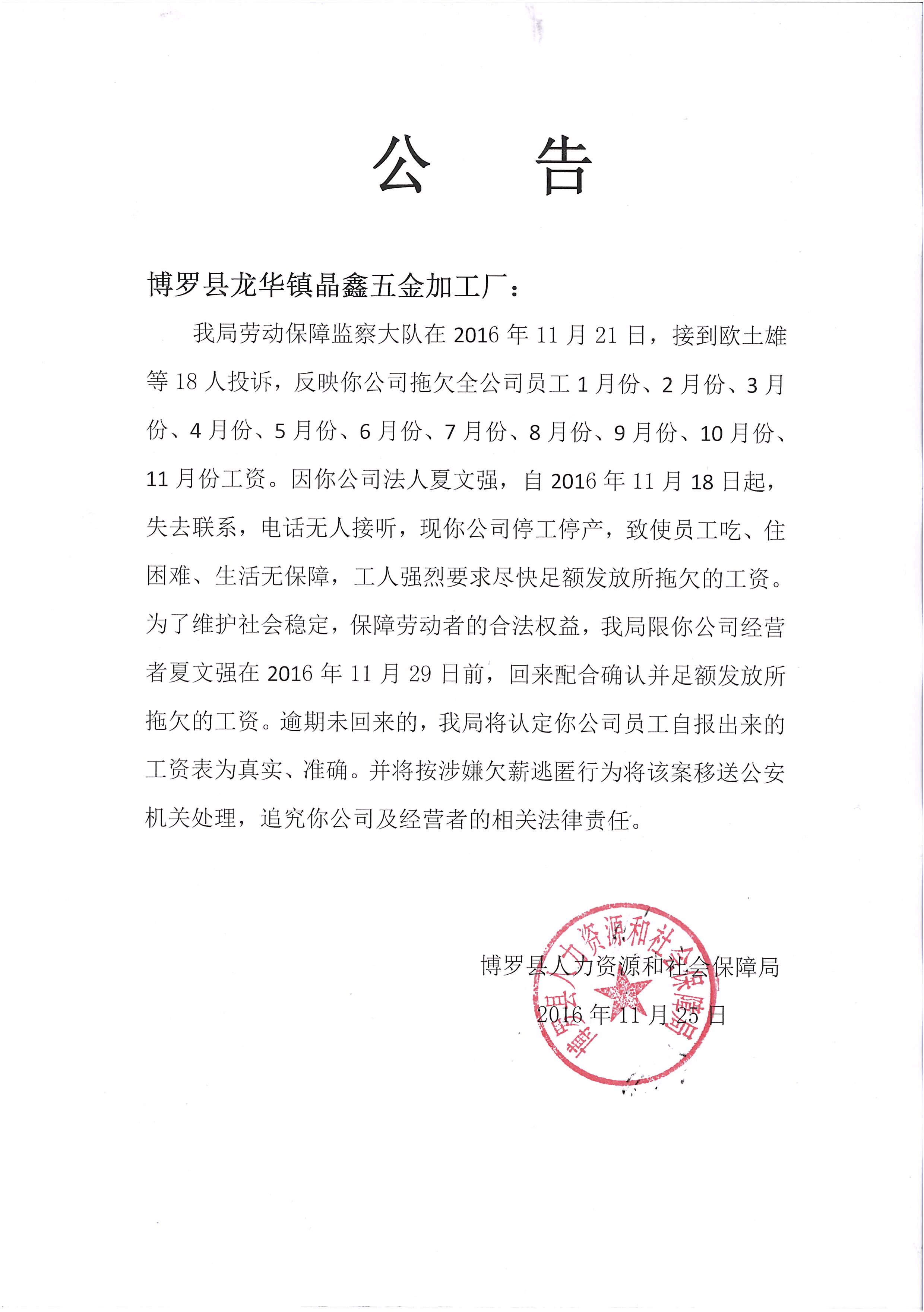 通知用人單位配合處理欠薪案件的公告(博羅縣龍華鎮晶鑫五金加工廠)