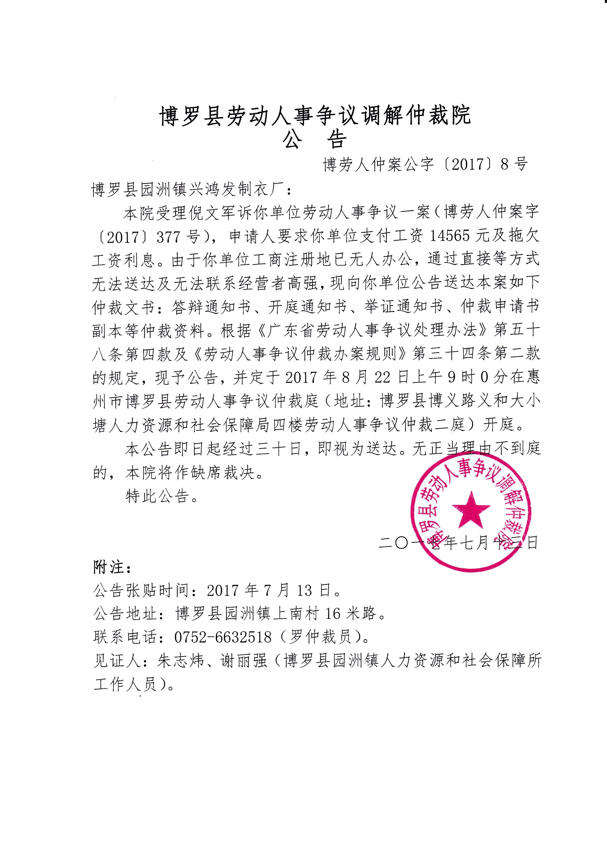 博羅縣勞動人事爭議調解仲裁院公告(博勞人仲案公字[2017]8號)