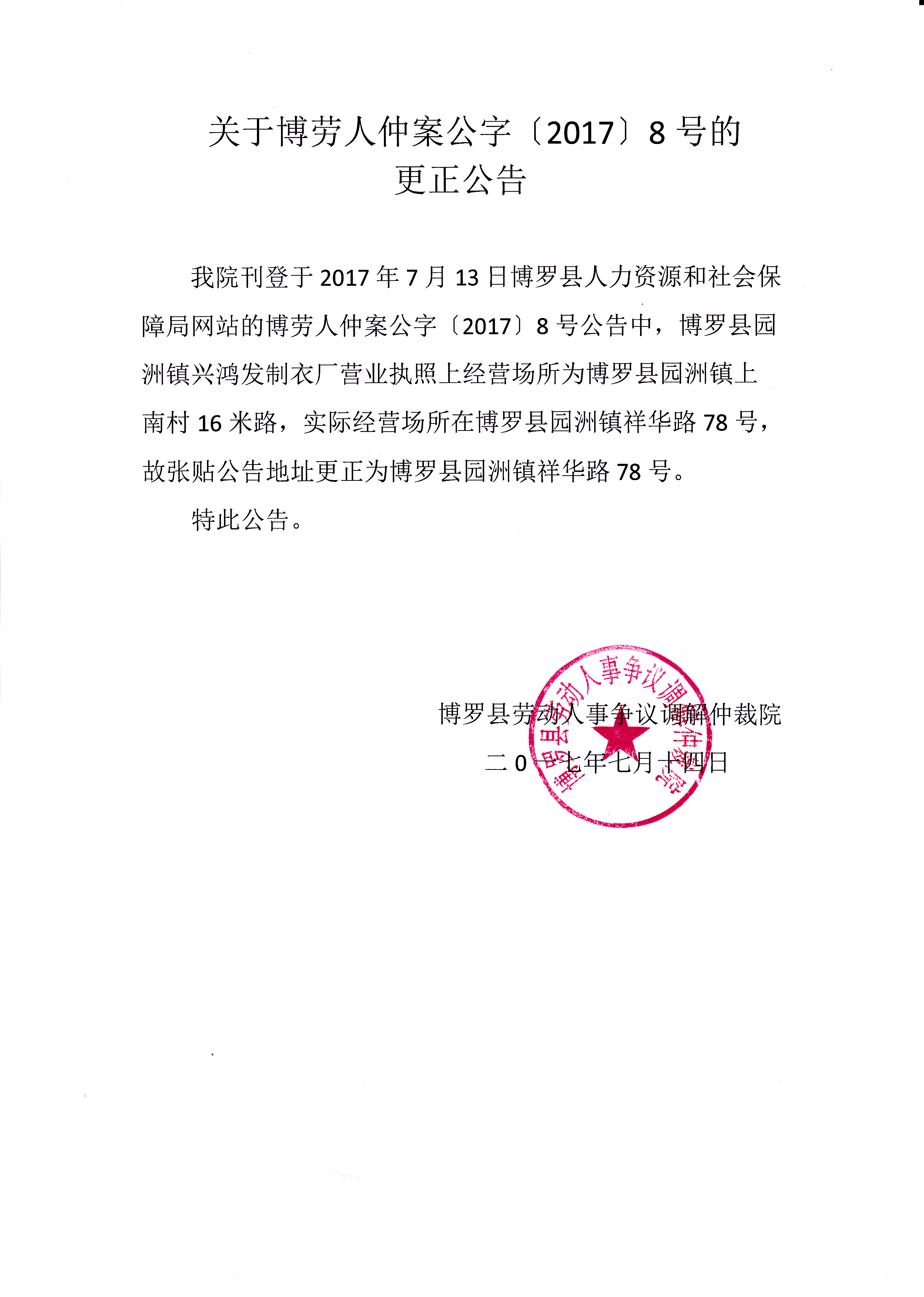 關(guān)于博勞人仲案公字[2017]8號(hào)的更正公告