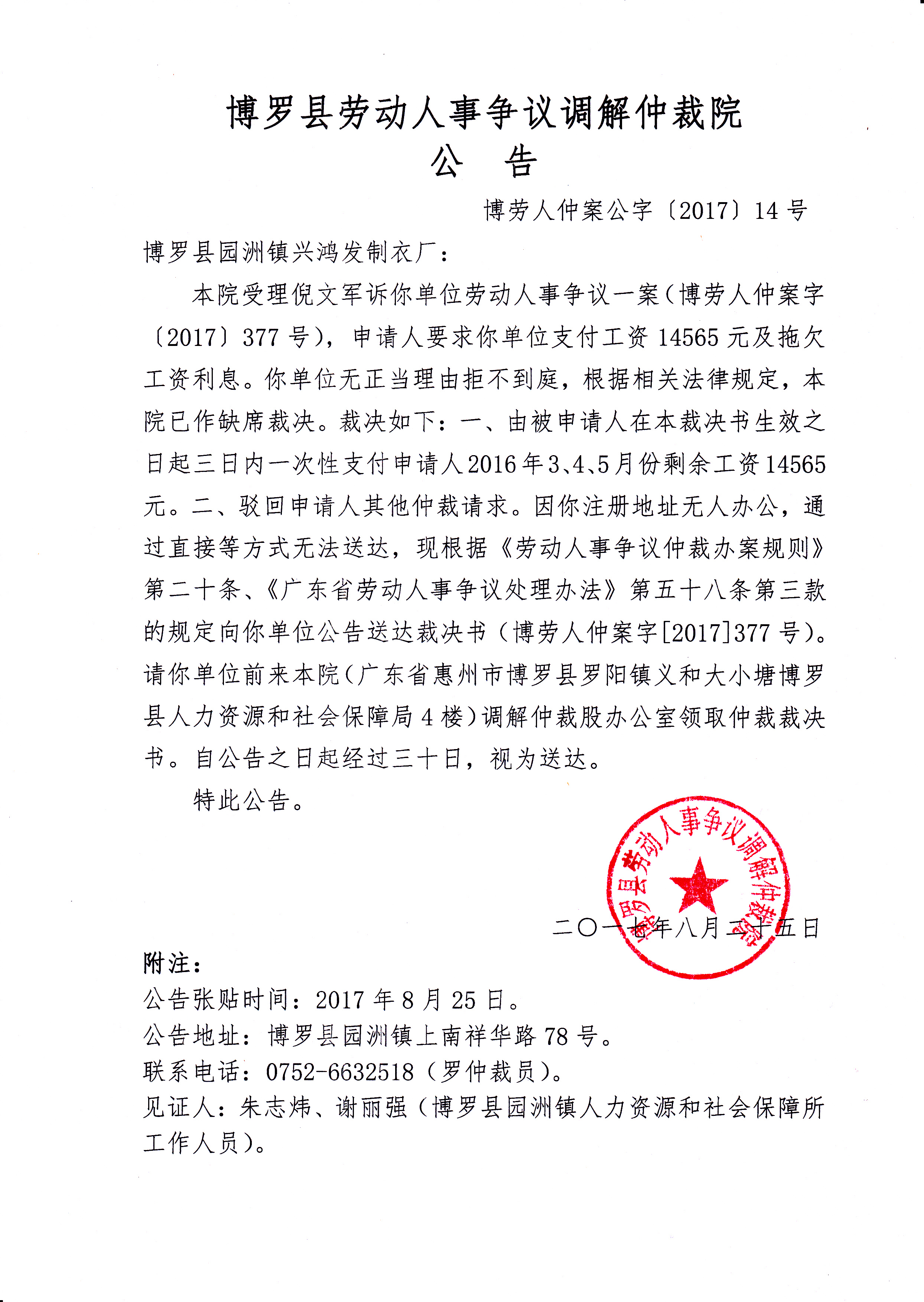 博羅縣勞動人事爭議調解仲裁院公告(博勞人仲案公字[2017]14號)