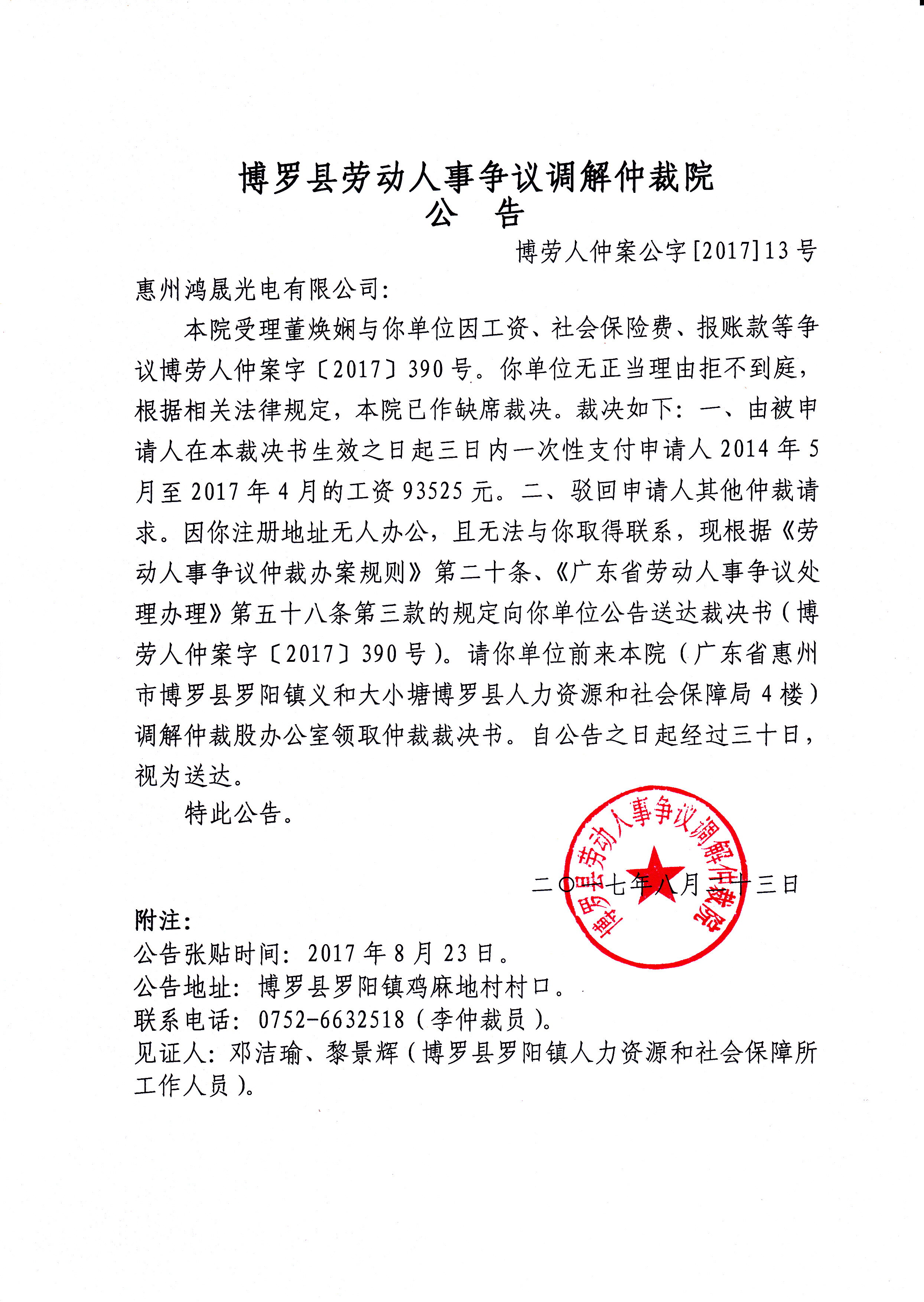 博羅縣勞動人事爭議調(diào)解仲裁院公告(博勞人仲案公字[2017]13號)
