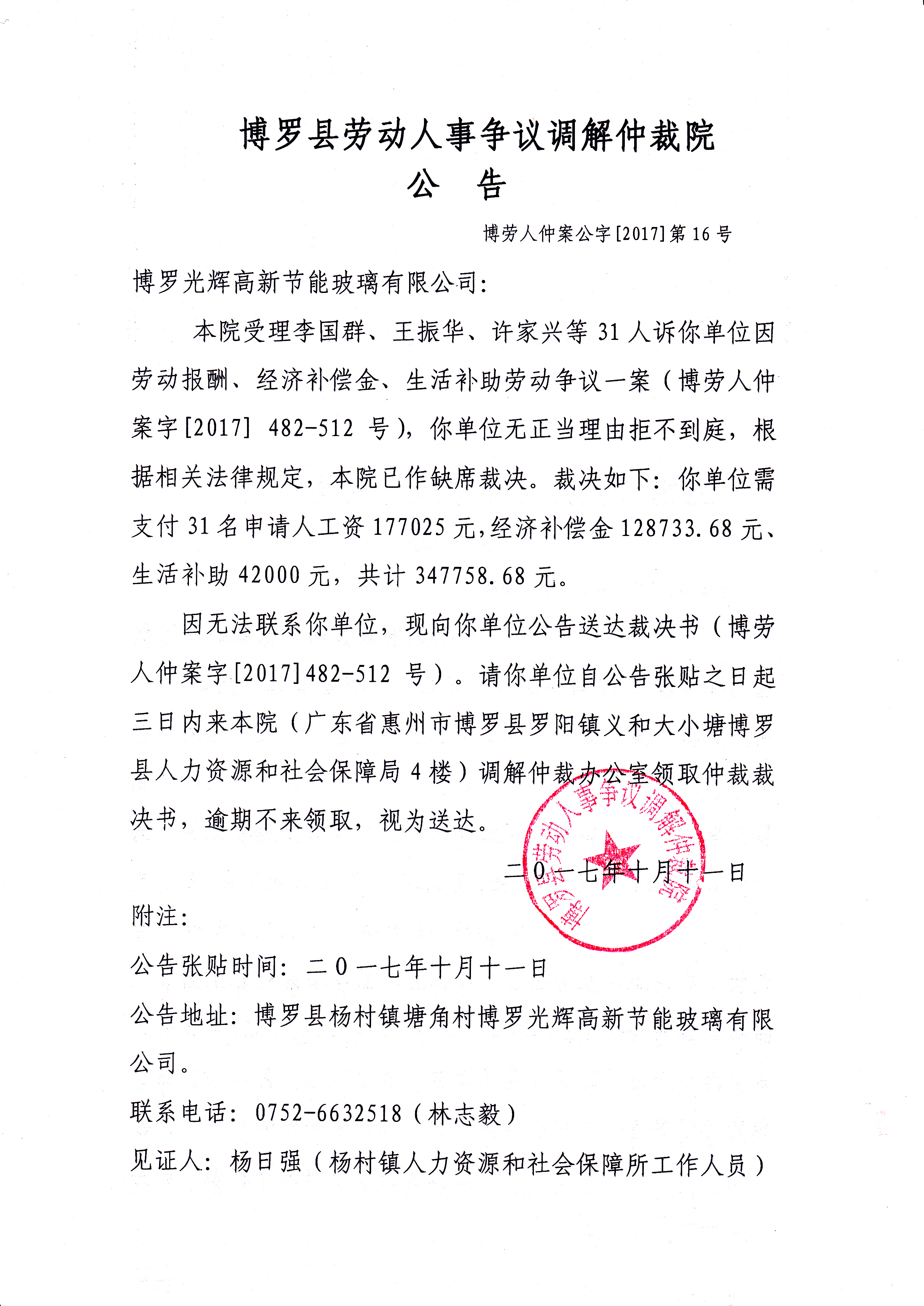博羅縣勞動人事爭議調解仲裁院公告(博勞人仲案公字[2017]16號)