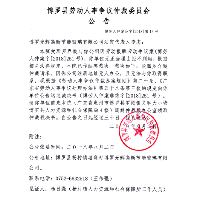 博羅縣勞動人事爭議仲裁委員會公告(博勞人仲案公字[2018]13號)