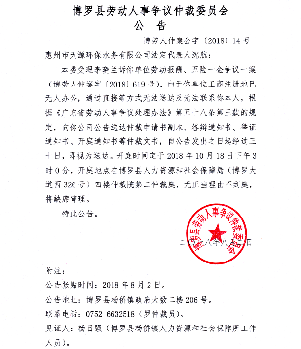 博羅縣勞動人事爭議仲裁委員會公告(博勞人仲案公字[2018]14號)