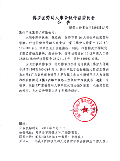 博羅縣勞動人事爭議仲裁委員會公告(博勞人仲案公字[2018]15號)