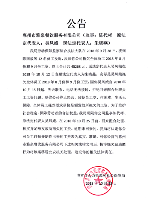 通知用人單位配合處理欠薪案件的公告(惠州市雅泉餐飲服務(wù)有限公司)