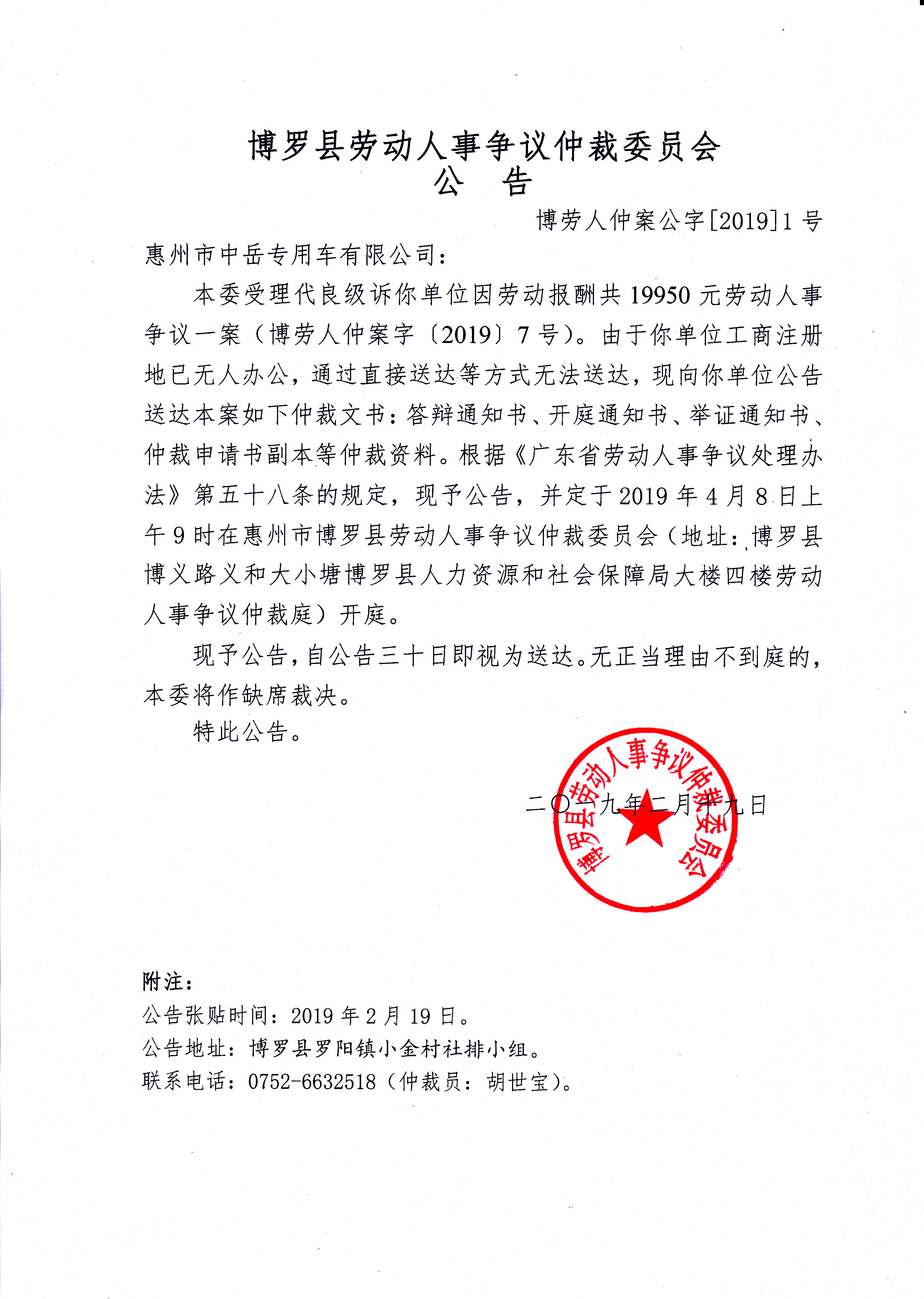 博羅縣勞動(dòng)人事?tīng)?zhēng)議仲裁委員會(huì)公告(博勞人仲案公字[2019]1號(hào))