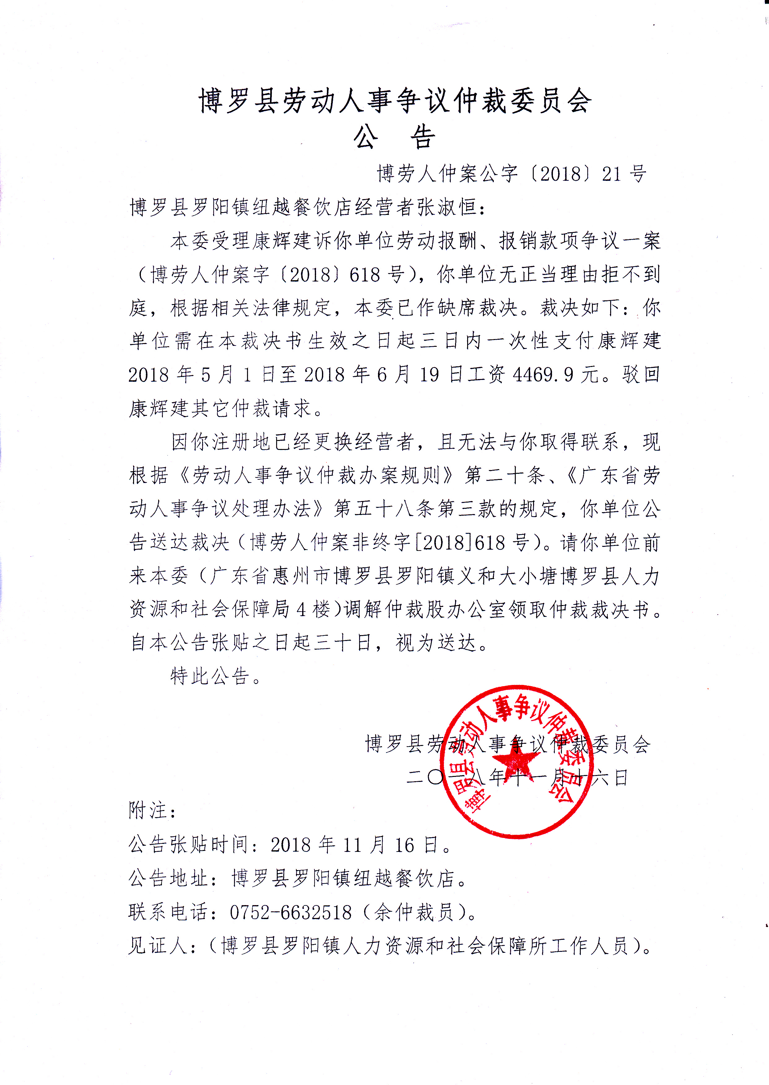 博羅縣勞動人事爭議仲裁委員會公告(博勞人仲案公字[2018]21號)