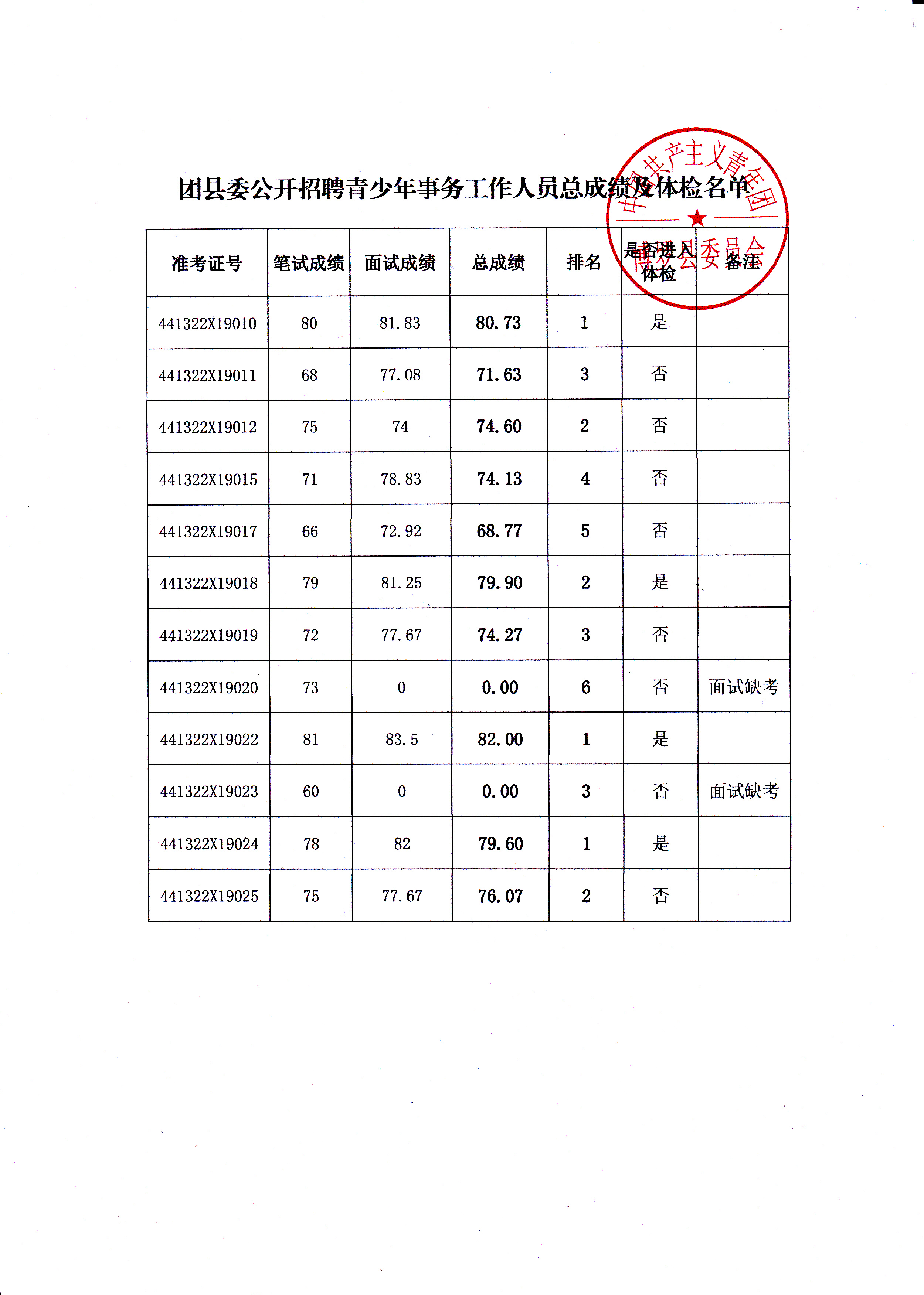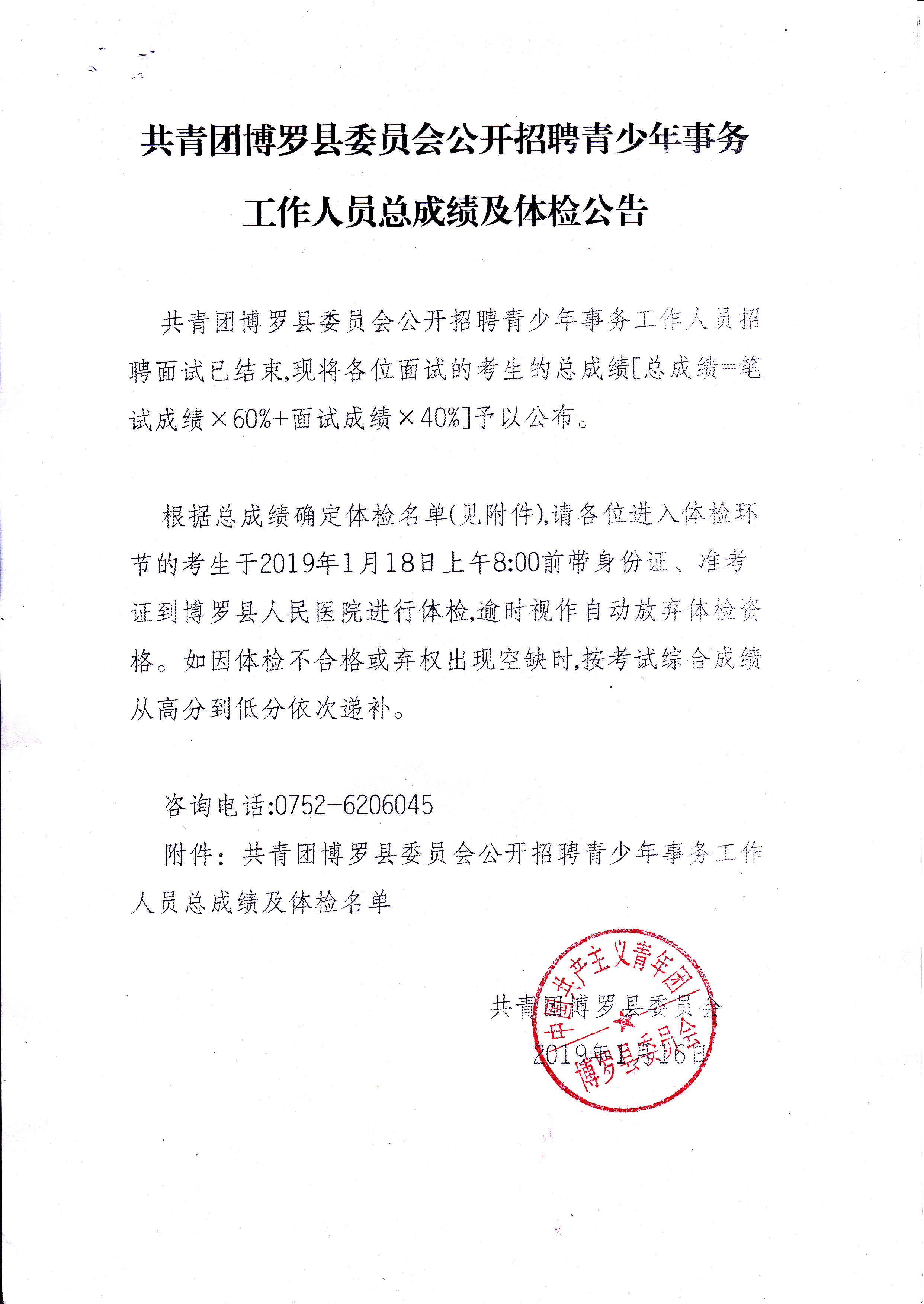 共青團博羅縣委員會公開招聘青少年事務工作人員總成績及體檢公告