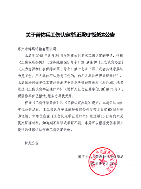 關(guān)于曾佑兵工傷認(rèn)定舉證通知書送達(dá)公告