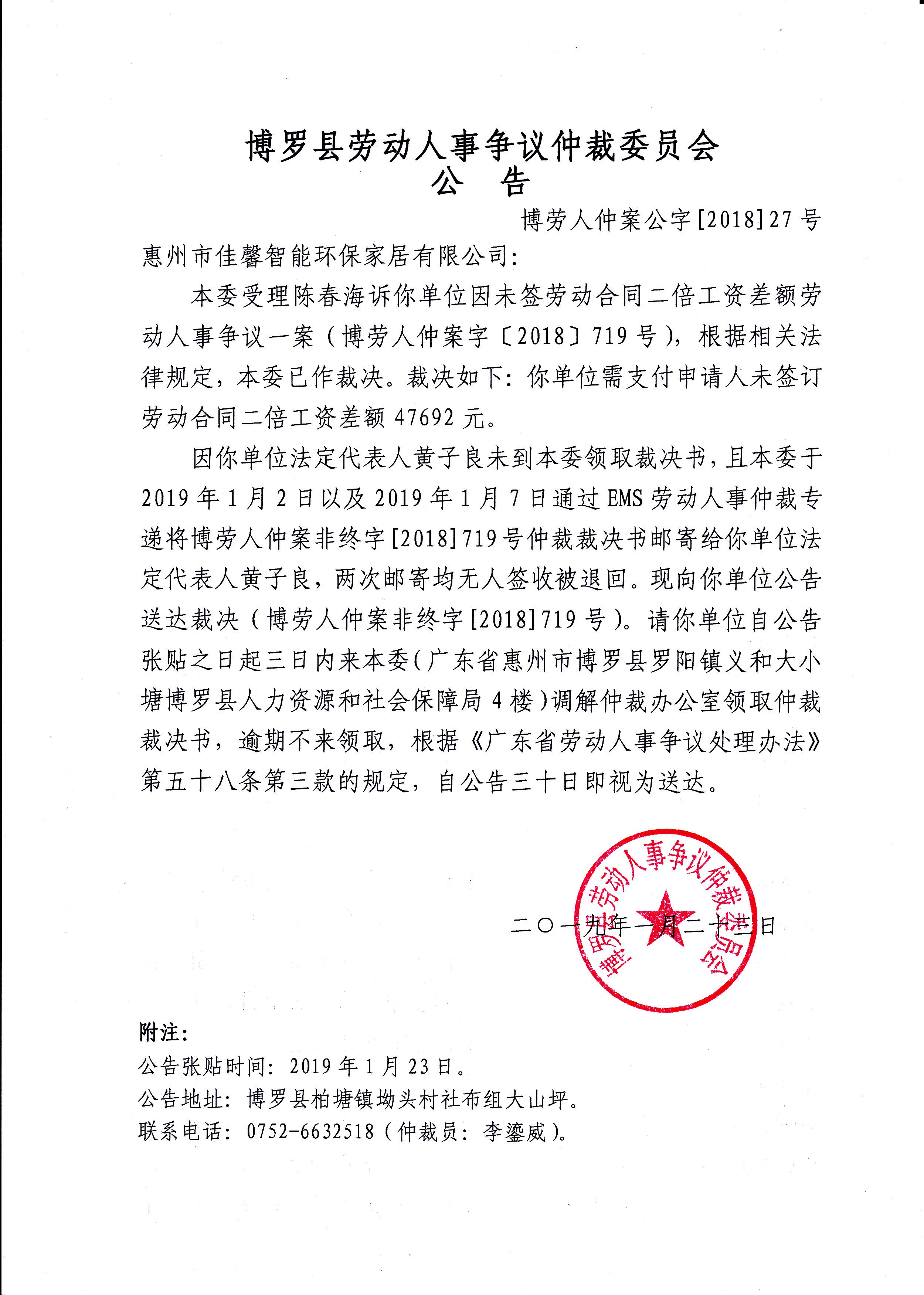 博羅縣勞動(dòng)人事?tīng)?zhēng)議仲裁委員會(huì)公告(博勞人仲案公字[2018]27號(hào))