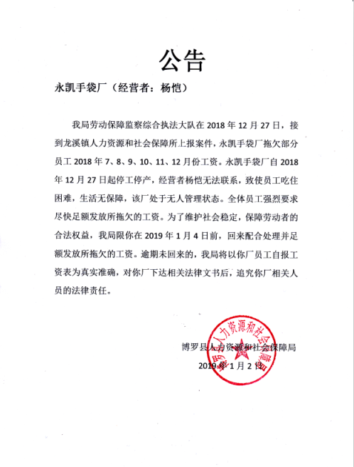 通知用人單位配合處理欠薪案件的公告(永凱手袋廠)