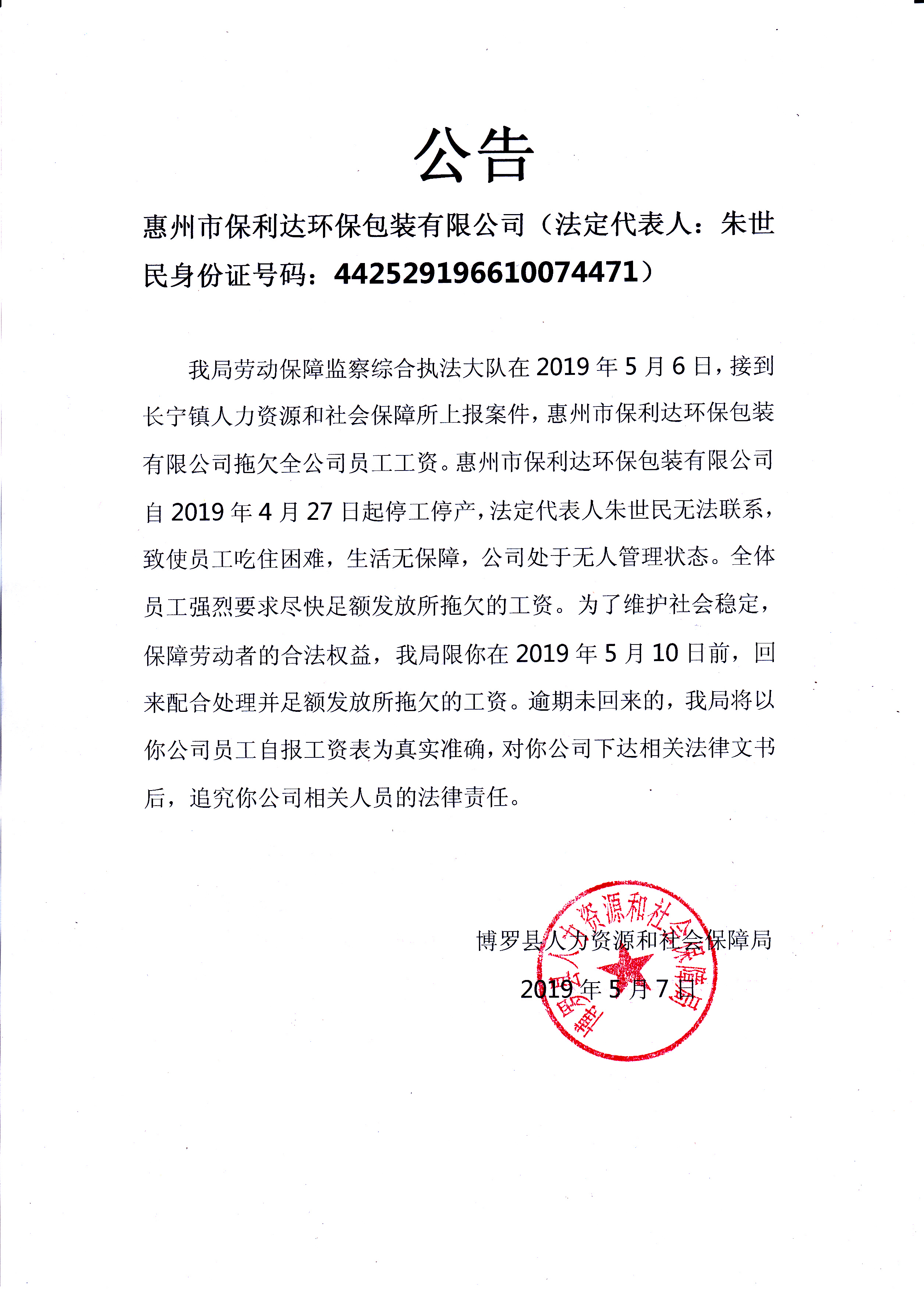 通知用人單位配合處理欠薪案件的公告(惠州市保利達環保包裝有限公司)