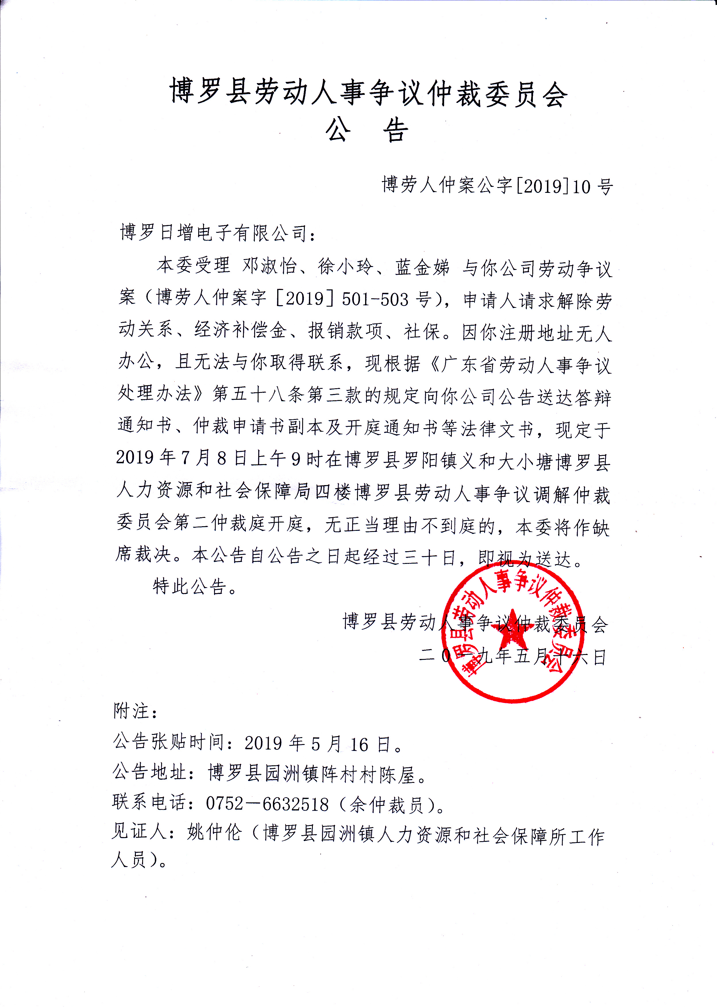 博羅縣勞動人事爭議仲裁委員會公告(博勞人仲案公字[2019]10號)