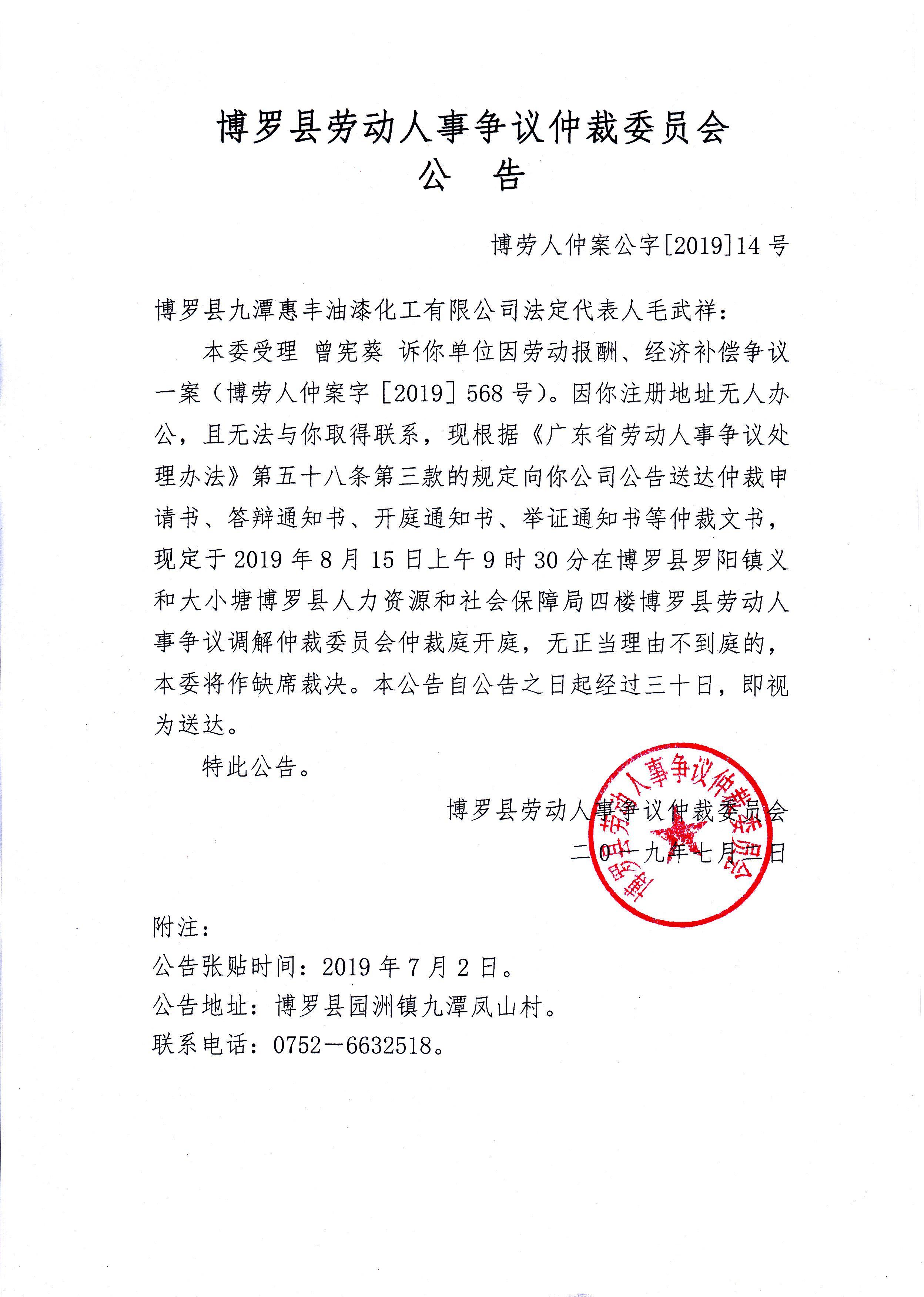 博羅縣勞動人事爭議仲裁委員會公告(博勞人仲案公字[2019]14號)
