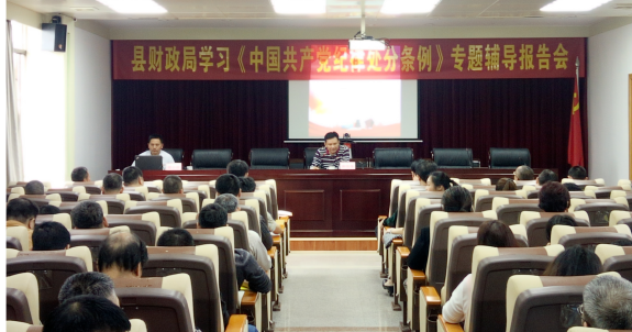 10月17日,按照紀律教育學習月活動計劃,博羅縣財政局舉行學習專題輔導報告會,邀請縣紀委駐縣財稅系統紀檢組組長郇小祥同志,作題為“學習貫徹《中華人民共和國監察法》《中國共產黨紀律處分條例》,落實全面從嚴治黨要求”的輔導報告。報告會由縣財政局黨組書記、局長林偉濤同志主持,縣財政局全體干部職工參加。