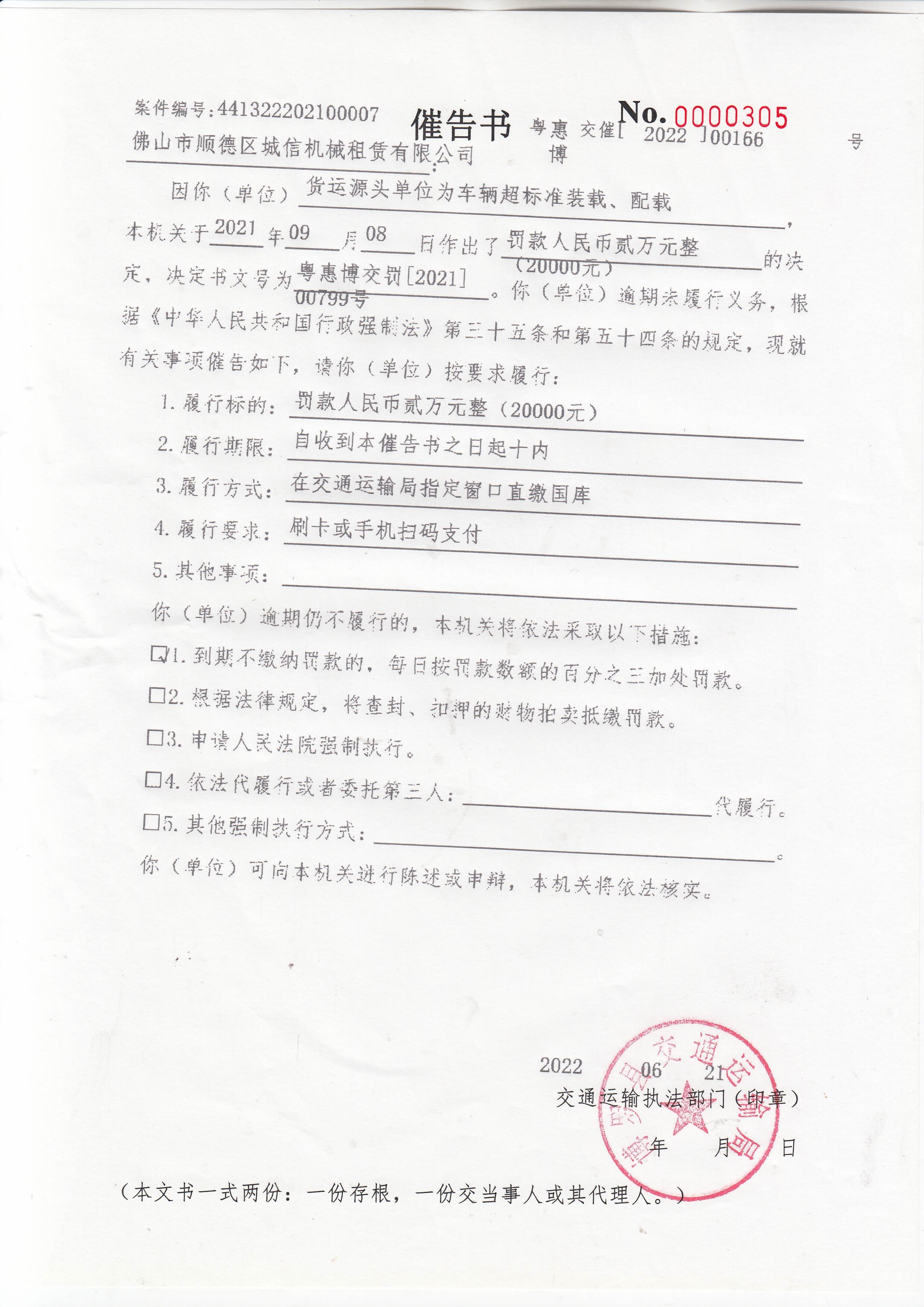 一、你公司貨運源頭單位為車輛超標(biāo)準(zhǔn)裝載、配載案,本機關(guān)于2021年09月08日作出了罰款人民幣貳萬元整(20000元)的決定,決定書文號為:惠博交罰[2021]00799號),但你公司在本機關(guān)決定的期限內(nèi)不履行義務(wù)。