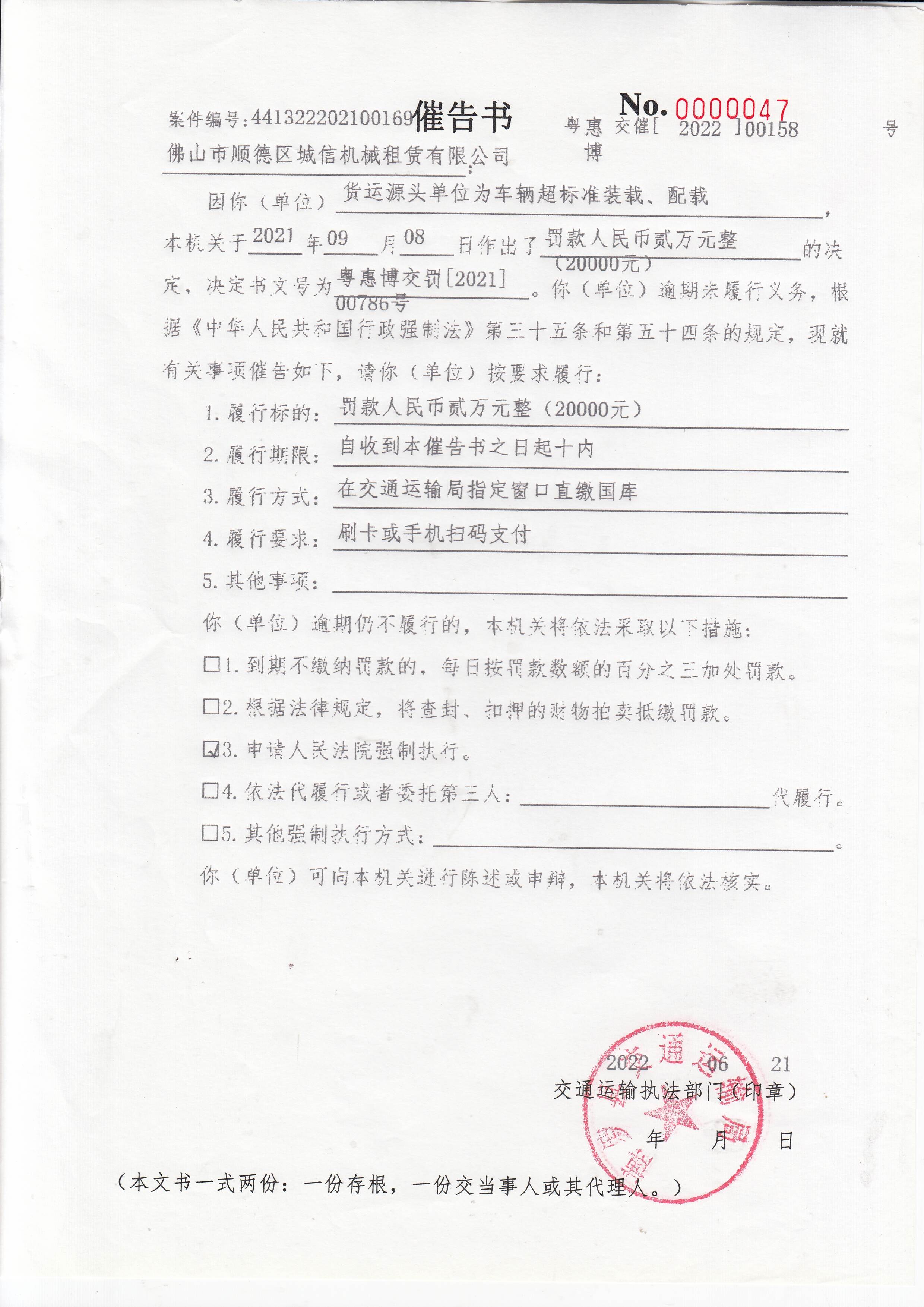 一、你公司貨運源頭單位涉嫌為車輛超標準裝載、配載案,本機關于2021年09月08日作出了罰款人民幣貳萬元整(20000元)的決定,決定書文號為:惠博交罰[2021]00786號),但你公司在本機關決定的期限內不履行義務。