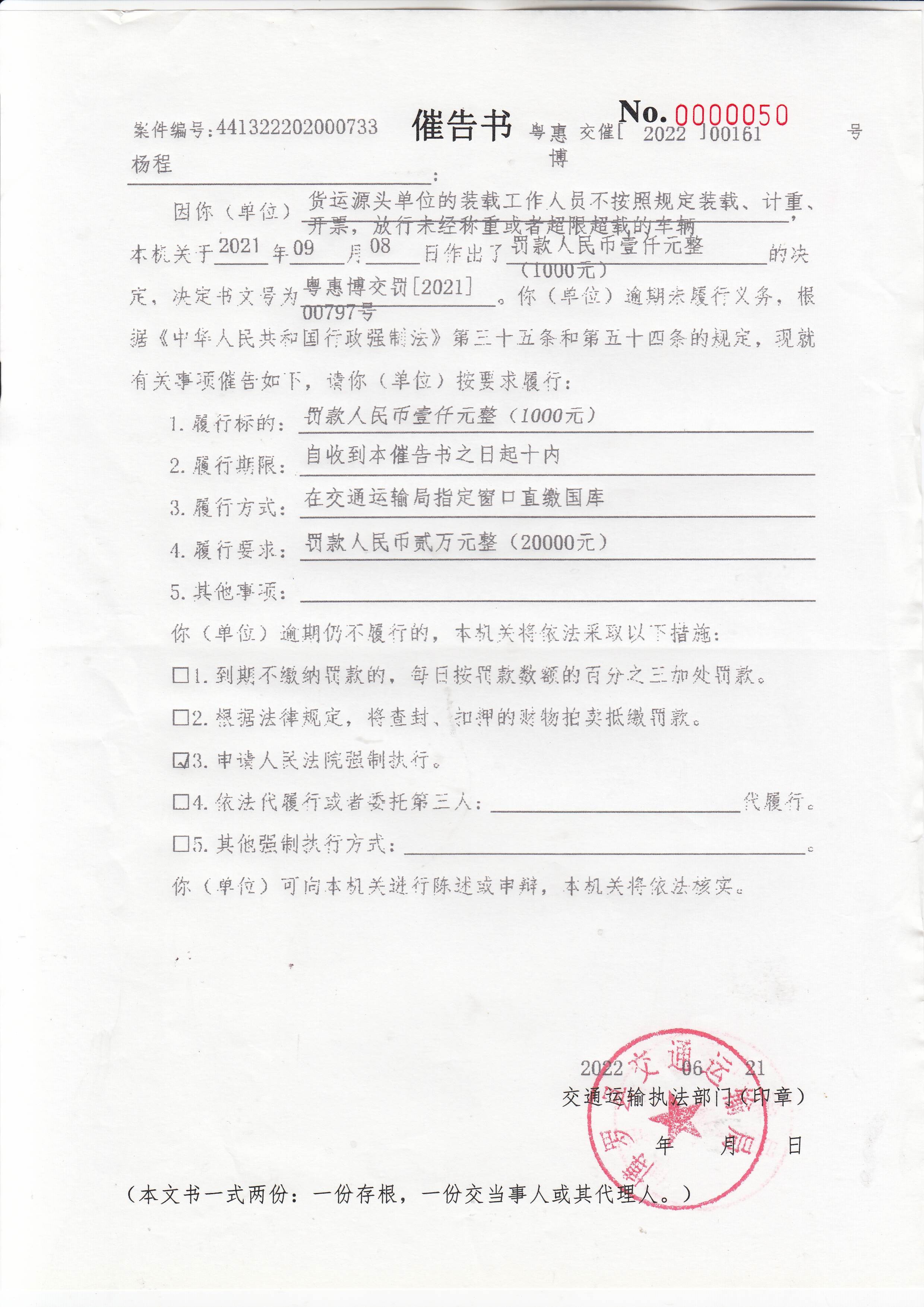 一、佛山市順德區城信機械租賃有限公司的司磅員楊程不按照規定放行超限超載車輛案,本機關于2021年09月08日作出了罰款人民幣壹仟元整(1000元)的決定,決定書文號為:惠博交罰[2021]00797號,但你在本機關決定的期限內不履行義務。