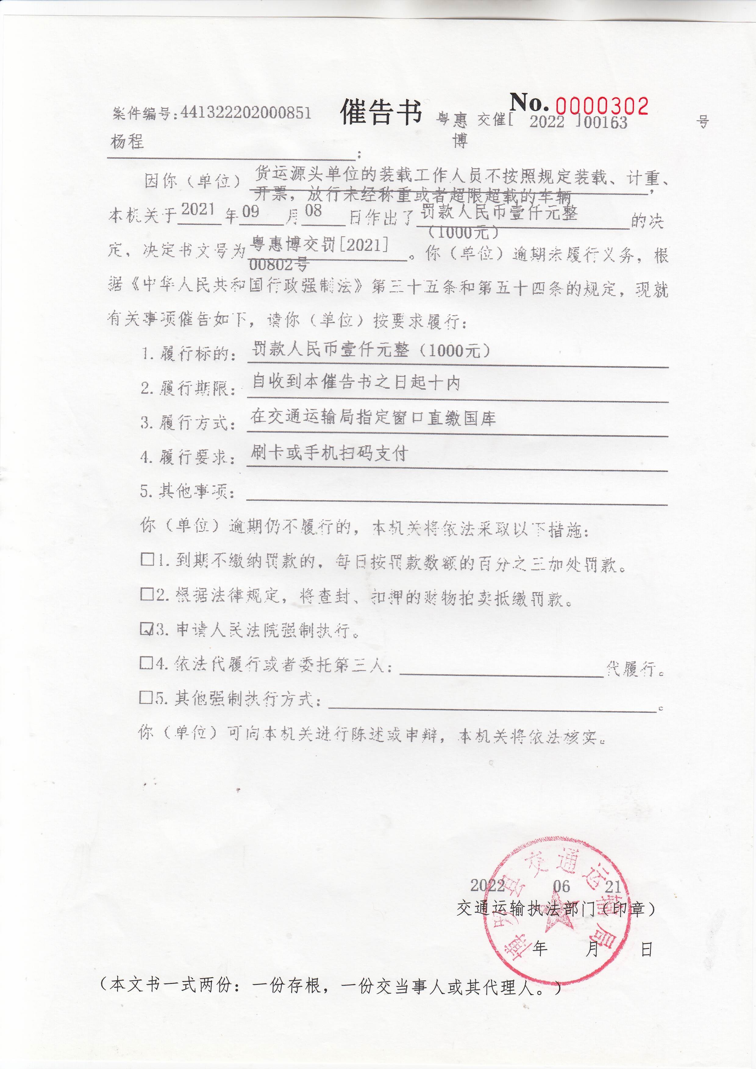 一、佛山市順德區城信機械租賃有限公司的司磅員楊程不按照規定放行超限超載車輛案,本機關于2021年09月08日作出了罰款人民幣壹仟元整(1000元)的決定,決定書文號為:惠博交罰[2021]00802號,但你在本機關決定的期限內不履行義務。