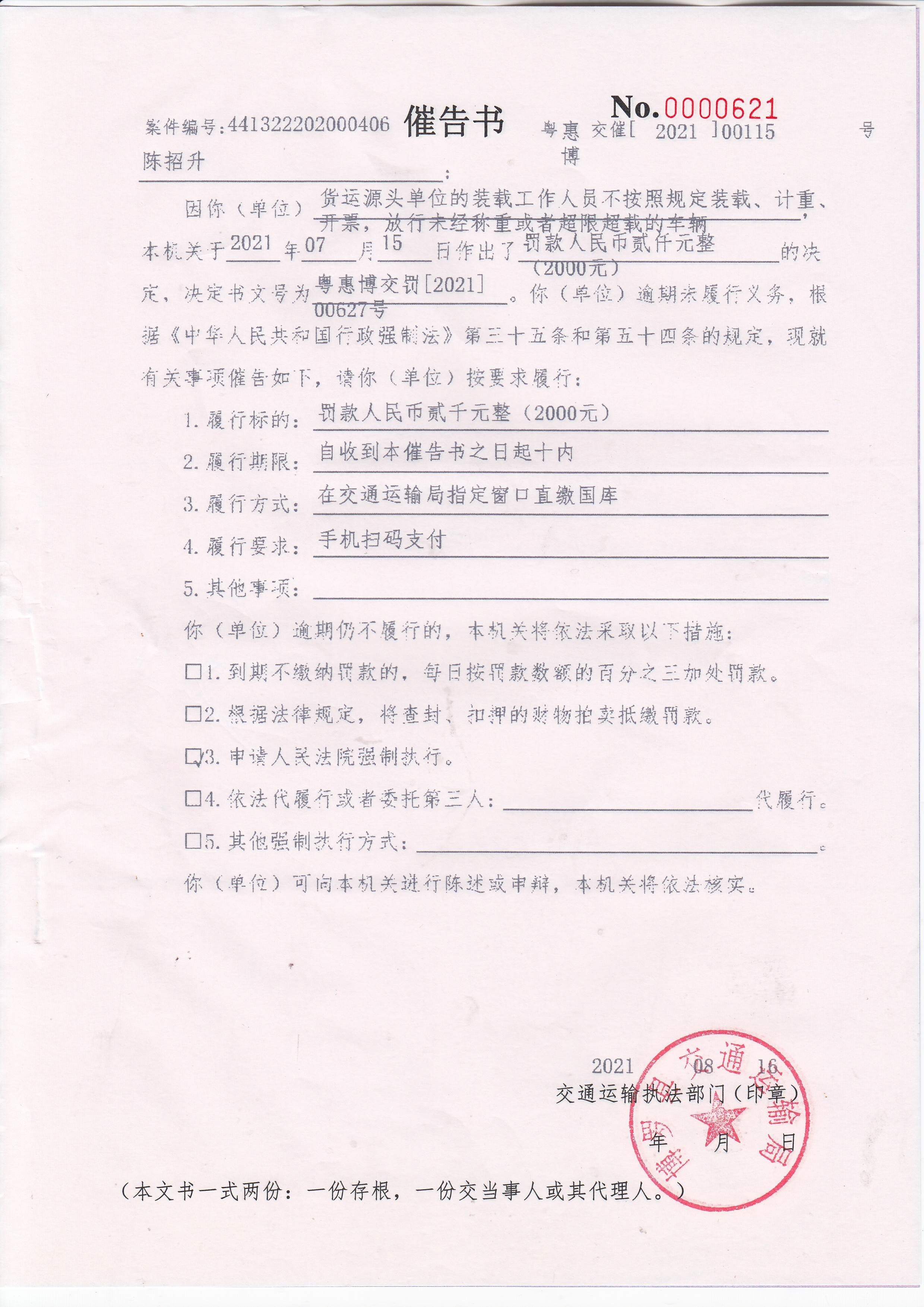 一、東莞市盛泰物流有限公司裝載負(fù)責(zé)人員陳招升放行超限超載的車輛案本機關(guān)于2021年07月15日作出了罰款人民幣貳仟元整(2000元)的決定,決定書文號為:惠博交罰[2021]00627號),但你在本機關(guān)決定的期限內(nèi)不履行義務(wù)。