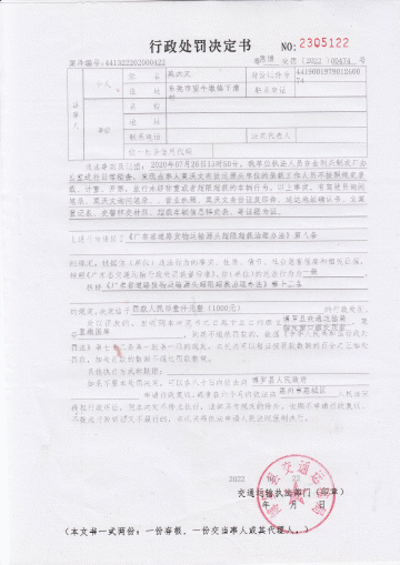 2020年07月26日15時50分,我單位執法人員在金利興制衣廠辦公室進行日常稽查,發現當事人莫沃文有貨運源頭單位的裝載工作人員不按照規定裝載、計重、開票,放行未經稱重或者超限超載的車輛行為。以上事實,有駕駛員詢問筆錄、莫沃文詢問筆錄、營業執照、莫沃文身份證復印件、送達地址確認書、立案登記表、交警移交材料、超載車輛信息移交表、等證據為證。違反了《廣東省道路貨物運輸源頭超限超載治理辦法》第八條的規定,的規定,依據《廣東省道路貨物運輸源頭超限超載治理辦法》第十三條的規定。我局決定給予你下列行政處罰:罰款:1000元。我局通過直接送達、郵寄送達等方式無法送達《行政處罰決定書》,現依法向你公告送達《行政處罰決定書》【編號:惠博交罰〔2022〕00474號】,限你自公告之日起30日內到我局領取《行政處罰決定書》(博羅縣羅陽街道博羅大道中685號),逾期則視為送達。