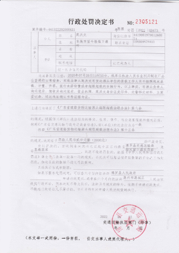 2020年07月26日15時(shí)50分,我單位執(zhí)法人員在金利興制衣廠辦公室進(jìn)行日常稽查,發(fā)現(xiàn)當(dāng)事人莫沃文有貨運(yùn)源頭單位的裝載工作人員不按照規(guī)定裝載、計(jì)重、開票,放行未經(jīng)稱重或者超限超載的車輛行為。以上事實(shí),有源頭負(fù)責(zé)人詢問筆錄、駕駛員詢問筆錄、營業(yè)執(zhí)照、莫沃文身份證復(fù)印件、交警移交材料、立案登記表、送達(dá)地址確認(rèn)書等證據(jù)為證。違反了《廣東省道路貨物運(yùn)輸源頭超限超載治理辦法》第八條的規(guī)定,依據(jù)《廣東省道路貨物運(yùn)輸源頭超限超載治理辦法》第十三條的規(guī)定。我局決定給予你下列行政處罰:罰款:2000元。我局通過直接送達(dá)、郵寄送達(dá)等方式無法送達(dá)《行政處罰決定書》,現(xiàn)依法向你公告送達(dá)《行政處罰決定書》【編號:惠博交罰〔2022〕00473號】,限你自公告之日起30日內(nèi)到我局領(lǐng)取《行政處罰決定書》(博羅縣羅陽街道博羅大道中685號),逾期則視為送達(dá)。