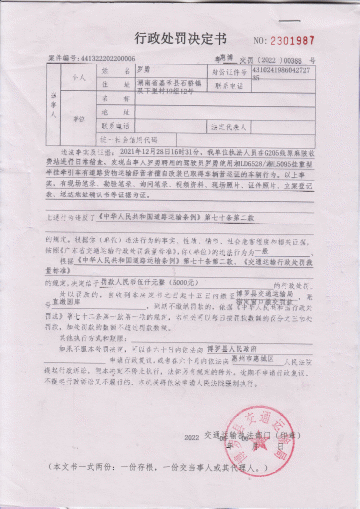 2021年12月28日16時31分,我單位執法人員在G205線原麻陂收費站進行日常稽查,發現當事人羅勇使用湘LD6528/湘L5095掛重型半掛牽引車有道路貨物運輸經營者擅自改裝已取得車輛營運證的車輛行為。以上事實,有現場筆錄、勘驗筆錄、詢問筆錄、視頻資料、現場照片、證件照片、立案登記表、送達地址確認書等證據為證。違反了《中華人民共和國道路運輸條例》第七十條第二款的規定,依據《中華人民共和國道路運輸條例》第七十條第二款、《交通運輸行政處罰裁量標準》的規定。我局決定給予你下列行政處罰:罰款:5000元。我局通過直接送達、郵寄送達等方式無法送達《行政處罰決定書》,現依法向你公告送達《行政處罰決定書》【編號:惠博交罰〔2022〕00388號】,限你自公告之日起30日內到我局領取《行政處罰決定書》(博羅縣羅陽街道博羅大道中685號),逾期則視為送達。