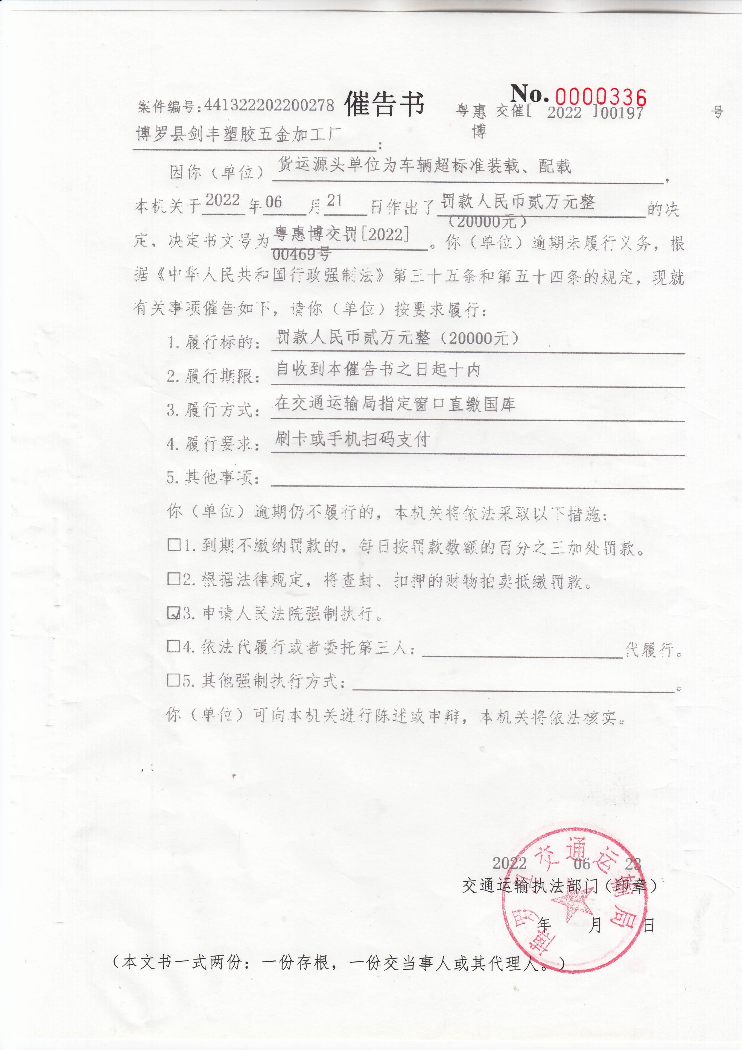 一、你加工廠為粵S83FB9輕型廂式貨車超標(biāo)準(zhǔn)裝載、配載案,本機(jī)關(guān)于2022年06月21日作出了罰款人民幣貳萬(wàn)元整(20000元)的決定,決定書(shū)文號(hào)為:惠博交罰[2022]00469號(hào)),但你加工廠在本機(jī)關(guān)決定的期限內(nèi)不履行義務(wù)。