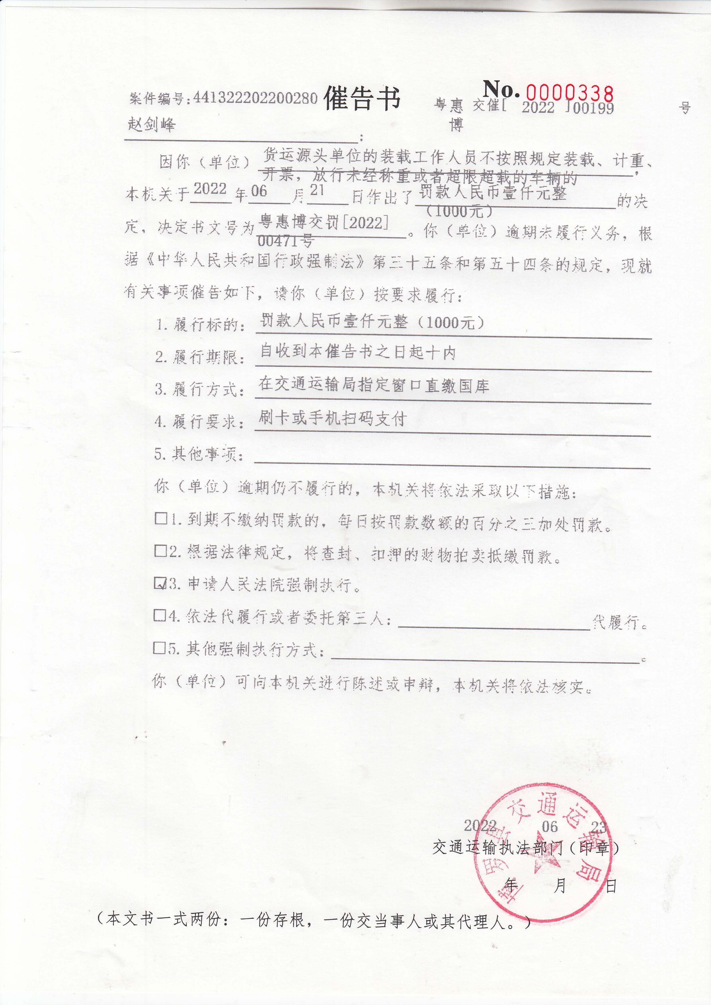 一、你不按照規定裝載、計重、開票,放行未經稱重或者超限超載的車輛一案,本機關于2022年06月21日作出了罰款人民幣壹仟元整(1000元)的決定,決定書文號為:惠博交罰[2022]00471號),但你在本機關決定的期限內不履行義務。