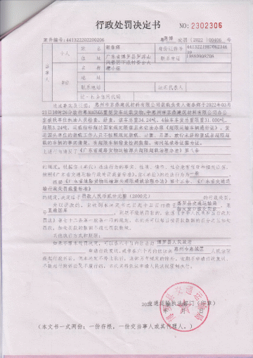 惠州市京鼎建筑材料有限公司裝載負責人謝春輝于2022年03月21日10時28分放行粵ABG565重型貨車運載貨物,于惠州市京鼎建筑材料有限公司辦公室被我單位執法人員檢查,經查,該車總重34.24噸,4軸車車貨總重限重31.000噸,超限3.24噸,運載指標超過國家規定限值且未依法辦理《超限運輸車輛通行證》。貨運源頭單位的裝載工作人員不按照規定裝載、計重、開票,放行未經稱重或者超限超載的車輛的事實清楚,有超限車輛稽查檢測數據,詢問筆錄等證據為證。違反了《廣東省道路貨物運輸源頭超限超載治理辦法》第八條的規定,依據《廣東省道路貨物運輸源頭超限超載治理辦法》第十三條、《廣東省交通運輸行政處罰裁量標準》的規定。我局決定給予你下列行政處罰:罰款:2000元。我局通過直接送達、郵寄送達等方式無法送達《行政處罰決定書》,現依法向你公告送達《行政處罰決定書》【編號:惠博交罰〔2022〕00406號】,限你自公告之日起30日內到我局領取《行政處罰決定書》(博羅縣羅陽街道博羅大道中685號),逾期則視為送達。