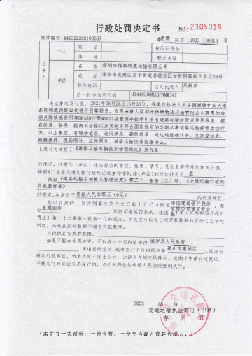 2021年08月26日16時30分,我單位執法人員在園洲鎮和安大道嘉民物流園路口處進行日常稽查,發現當事人深圳市偉順物流運輸有限公司聘用的駕駛員陳煥逸使用粵BKA397/粵MG022掛重型半掛牽引車有道路運輸經營者使用報廢、擅自改裝、拼裝、檢測不合格以及其他不符合國家規定的車輛從事道路運輸經營活動行為。以上事實,有現場筆錄、詢問筆錄、勘驗筆錄、送達地址確認書、立案登記表、視頻資料、現場照片、證件照片、道路運輸證等證據為證。違反了《道路運輸車輛技術管理規定》第九條的規定,依據《道路運輸車輛技術管理規定》第三十一條第(二)項、《交通運輸行政處罰裁量標準》的規定。我局決定給予你警告行政處罰。我局通過直接送達、郵寄送達等方式無法送達《行政處罰決定書》,現依法向你公告送達《行政處罰決定書》【編號:惠博交罰〔2022〕00318號】,限你自公告之日起30日內到我局領取《行政處罰決定書》(博羅縣羅陽街道博羅大道中685號),逾期則視為送達。