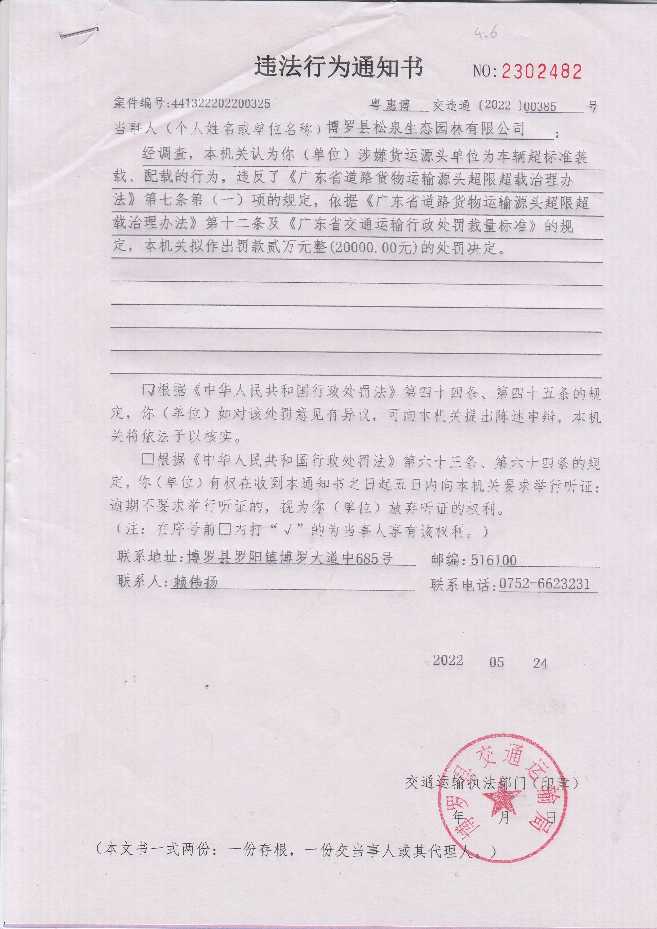 經(jīng)本機關依法查明,本機關認為你公司涉嫌貨運源頭單位為車輛超標準裝載、配載的行為,違反了《廣東省道路貨物運輸源頭超限超載治理辦法》第七條第(一)項的規(guī)定,依據(jù)《廣東省道路貨物運輸源頭超限超載治理辦法》第十二條及《廣東省交通運輸行政處罰裁量標準》的規(guī)定,本機關擬作出罰款貳萬元整(20000.00元)的處罰決定。因其他法定方式無法送達,現(xiàn)依法向你單位公告送達《違法行為通知書》(惠博交字【2022】00385號),自公告之日起30日內(nèi)來我局(博羅縣羅陽街道辦事處博羅大道中685號)簽收,逾期視為送達。