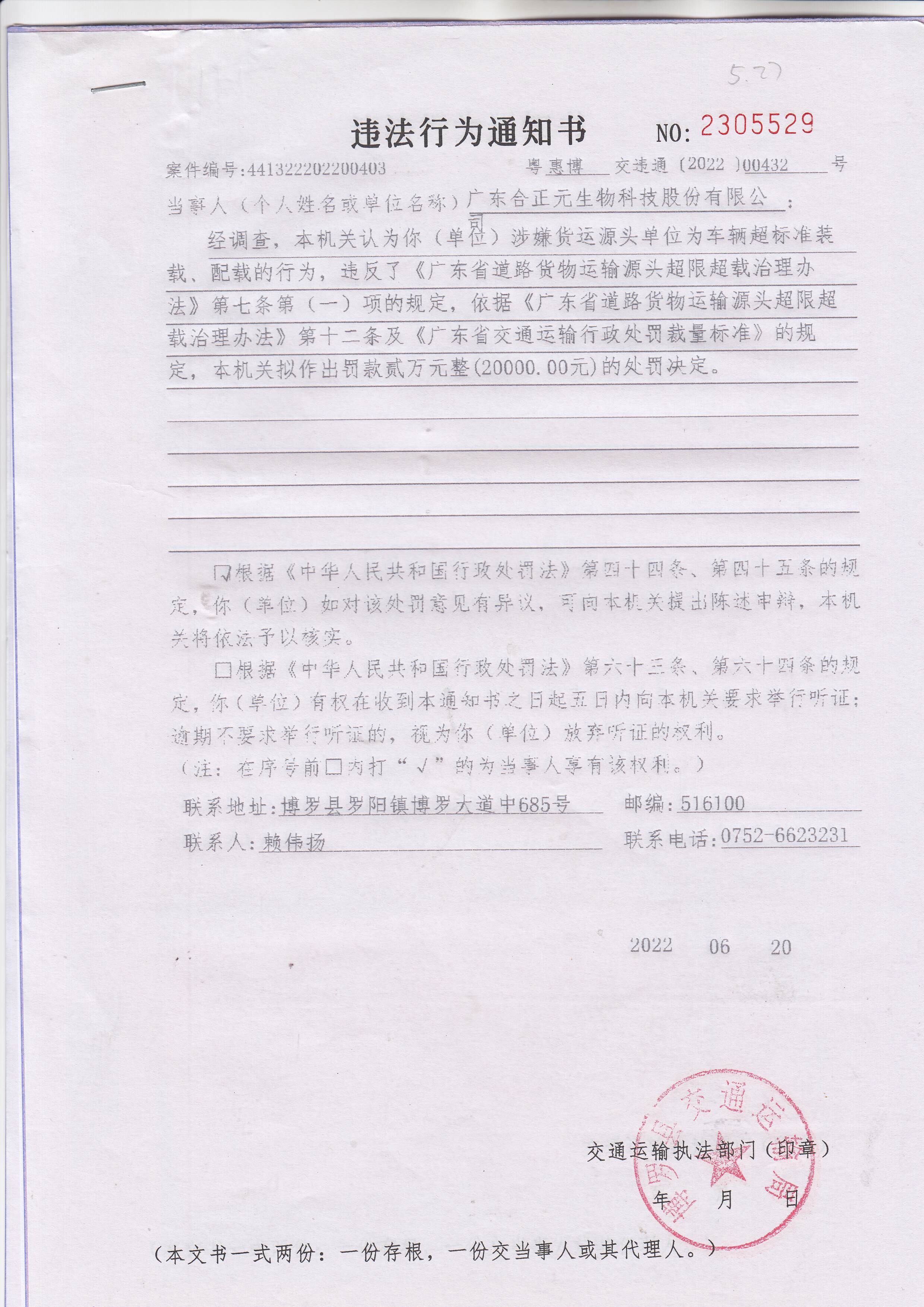 經(jīng)本機(jī)關(guān)依法查明,認(rèn)為你涉嫌貨運(yùn)源頭單位為車輛超標(biāo)準(zhǔn)裝載、配載的行為,違反了《廣東省道路貨物運(yùn)輸源頭超限超載治理辦法》第七條第(一)項(xiàng)的規(guī)定,依據(jù)《廣東省道路貨物運(yùn)輸源頭超限超載治理辦法》第十二條及《廣東省交通運(yùn)輸行政處罰裁量標(biāo)準(zhǔn)》的規(guī)定,本機(jī)關(guān)擬作出罰款貳萬(wàn)元整(20000.00元)的處罰決定。因其他法定方式無(wú)法送達(dá),現(xiàn)依法向你單位公告送達(dá)《違法行為通知書(shū)》(惠博交字【2022】00432號(hào)),自公告之日起30日內(nèi)來(lái)我局(博羅縣羅陽(yáng)街道辦事處博羅大道中685號(hào))簽收,逾期視為送達(dá)。